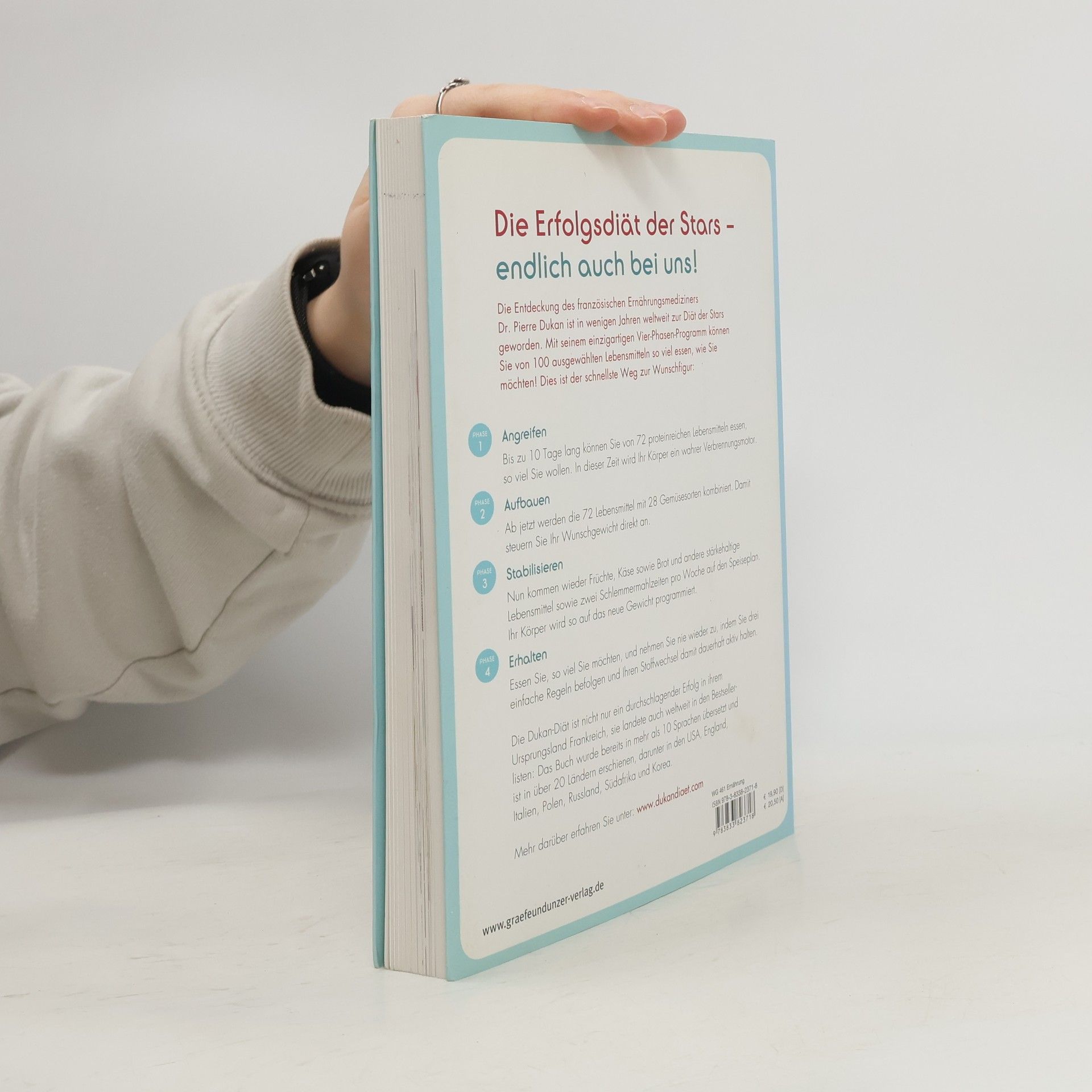 Der Bestseller aus Frankreich, England und den USA nun endlich auch bei uns! Dr. Dukans Diät besteht aus einem ausgeklügelten 4-Phasen-Programm: In der Angriffsphase werden nur eiweißlastige Nahrungsmittel wie Eier, Fisch und Fleisch verzehrt. Der Körper verliert so schnell an Kilos - ohne, dass Muskeln abgebaut werden. Die Aufbauphase erlaubt wieder Kohlenhydrate in Form von Gemüse. In der Stabilisierungsphase soll das erreichte Zielgewicht gehalten werden: Jetzt kehren Nudeln und Brot zurück - zwei Mahlzeiten pro Woche sind zum Schlemmen da. Danach beginnt die Erhaltungssphase: In Maßen ist alles wieder erlaubt. Nur ein Protein-Tag pro Woche verhindert, dass der Jo-Jo-Effekt auftritt. So ist eine dauerhafte Ernährungsumstellung gut durchzuhalten. Abgestimmt auf unsere Vorlieben und ausgestattet mit schmackhaften Rezepten wird dieses Konzept auch den Deutschen erfolgreich beim Abnehmen helfen!