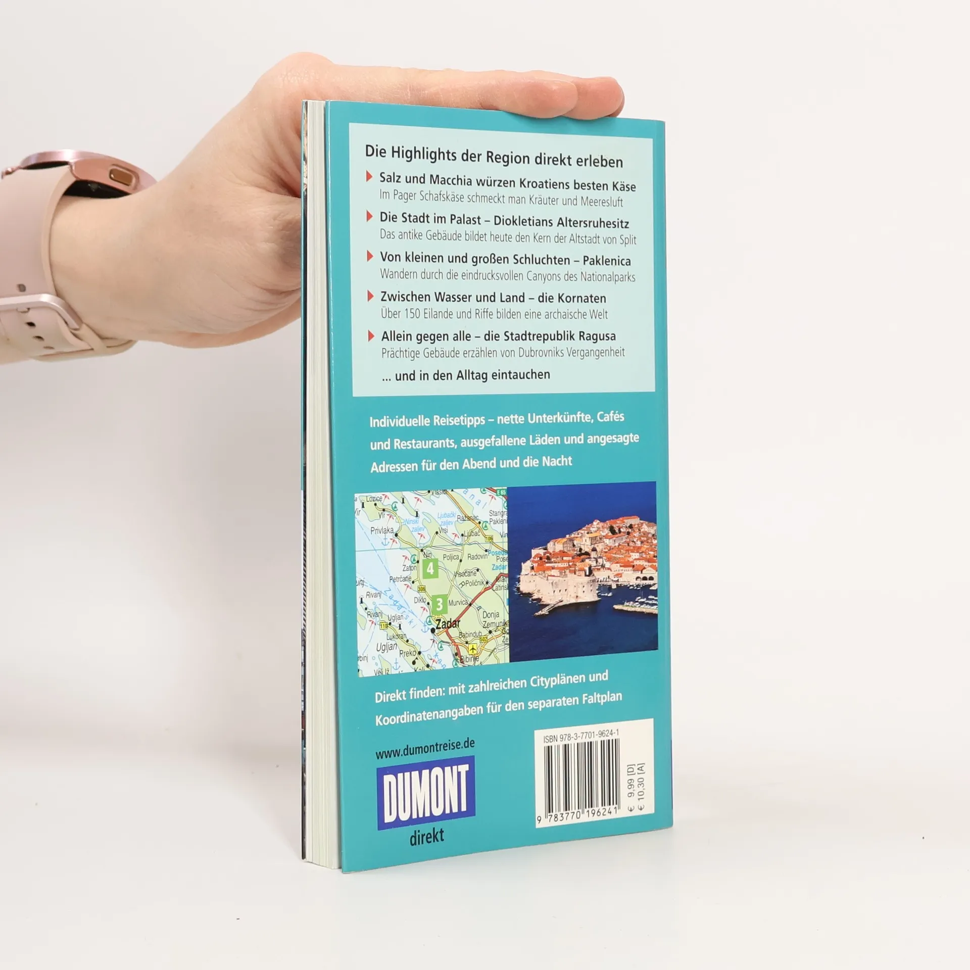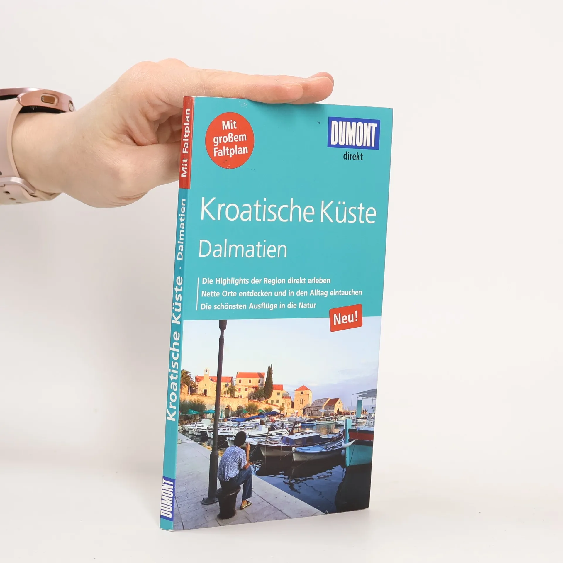 Der Band beschreibt die Adriaküste Kroatiens von Rijeka bis Dubrovnik und von der Insel Pag bis zur Grenze zu Montenegro, geprägt von zahlreichen vorgelagerten Inseln. Für dieses Traumziel gibt es zahlreiche Urlaubstipps, die auf Familien, Singles, Sportler, Kulturinteressierte und Abenteuerlustige zugeschnitten sind. In 15 „Direkt-Kapiteln“ führt die Autorin zu den Highlights der Region und bietet Anregungen für einen erlebnisreichen Urlaub: Käse auf Pag, die Schlucht Paklenica, öffentliche Kunst in Zadar, Religionsstreit in Nin, die Kornaten, die Kathedrale von Sibenik, Trogir, den Palast der Spliter Altstadt, Bracer Marmor in Hvar-Stadt, Weine der Halbinsel Peljesac und Wandern auf der Insel Lopud. Handverlesene Adressen für Übernachtungen, Essen, Trinken und Ausgehen machen die Reise zum Erlebnis. Jede Adresse ist mit einem Schlagwort versehen, was die Orientierung erleichtert. Ein separater Faltplan (Maßstab 1:700.000) mit Ortsregister und Entfernungstabelle zeigt alle genannten Orte und ermöglicht eine einfache Auffindbarkeit. Die Übersichtskarte hebt die Highlights hervor, während Stadt- und Detailpläne präzise Orientierung in Zadar, Split, Hvar, Korcula-Stadt und Dubrovnik bieten.