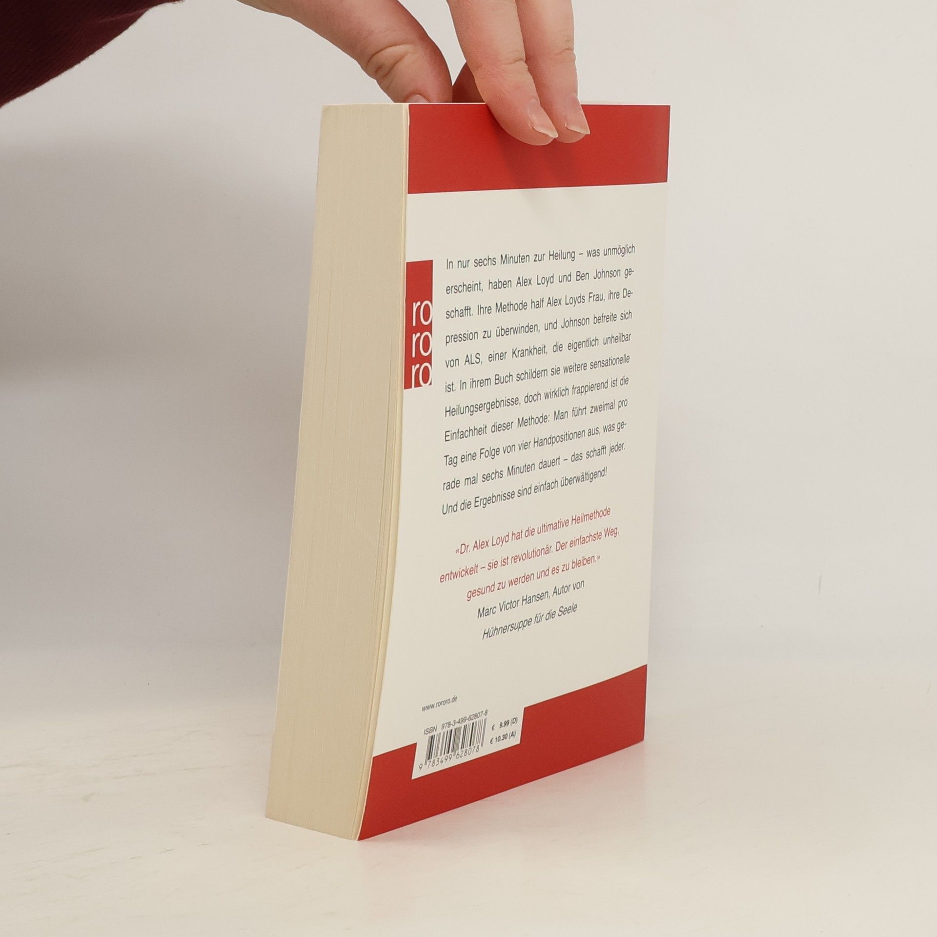 In nur sechs Minuten zur Heilung – was unmöglich erscheint, haben Alex Loyd und Ben Johnson geschafft. Ihre Methode half Alex Loyds Frau, ihre Depression zu überwinden, und Johnson befreite sich von ALS, einer Krankheit, die eigentlich unheilbar ist. In ihrem Buch schildern sie weitere sensationelle Heilungsergebnisse, doch wirklich frappierend ist die Einfachheit dieser Methode: Man führt zweimal pro Tag eine Folge von vier Handpositionen aus, was gerade mal sechs Minuten dauert – das schafft jeder. Und die Ergebnisse sind einfach überwältigend!«Dr. Alex Loyd hat die ultimative Heilmethode entwickelt – sie ist revolutionär. Der einfachste Weg, gesund zu werden und es zu bleiben.» Marc Victor Hansen, Autor von Hühnersuppe für die Seele