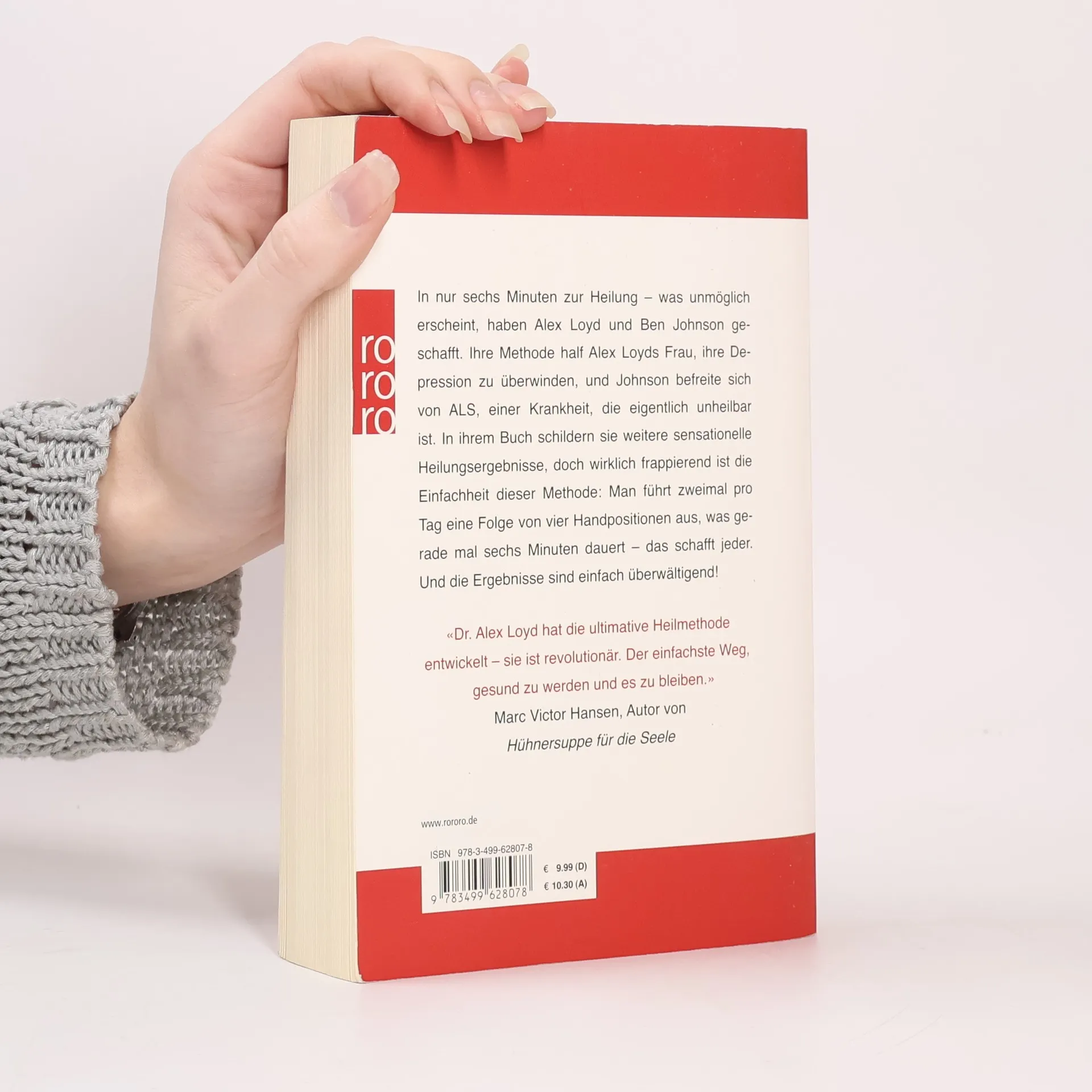 In nur sechs Minuten zur Heilung – was unmöglich erscheint, haben Alex Loyd und Ben Johnson geschafft. Ihre Methode half Alex Loyds Frau, ihre Depression zu überwinden, und Johnson befreite sich von ALS, einer Krankheit, die eigentlich unheilbar ist. In ihrem Buch schildern sie weitere sensationelle Heilungsergebnisse, doch wirklich frappierend ist die Einfachheit dieser Methode: Man führt zweimal pro Tag eine Folge von vier Handpositionen aus, was gerade mal sechs Minuten dauert – das schafft jeder. Und die Ergebnisse sind einfach überwältigend!«Dr. Alex Loyd hat die ultimative Heilmethode entwickelt – sie ist revolutionär. Der einfachste Weg, gesund zu werden und es zu bleiben.» Marc Victor Hansen, Autor von Hühnersuppe für die Seele