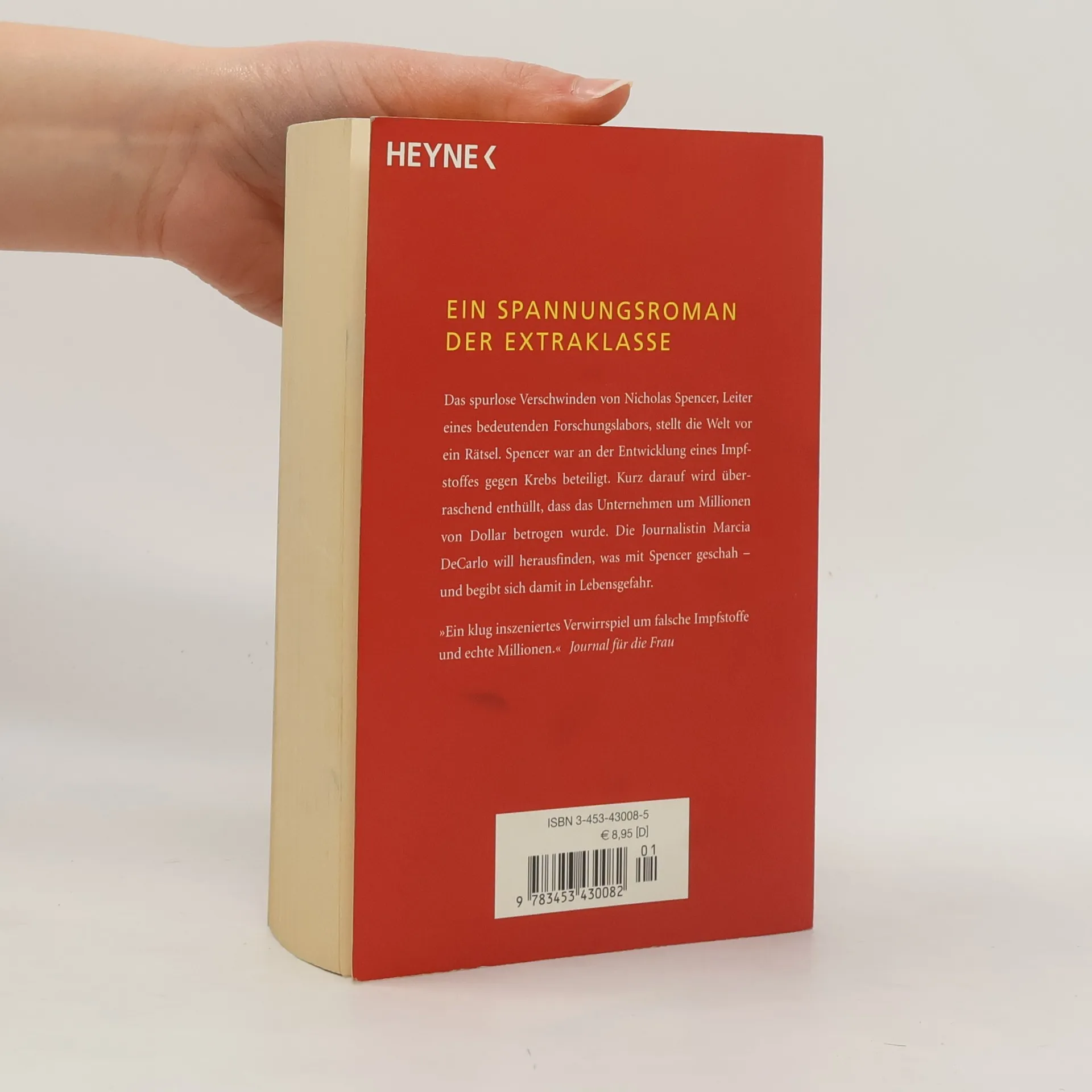 Ein Spannungsroman der Extraklasse: Das spurlose Verschwinden von Nicholas Spencer, Leiter eines bedeutenden pharmazeutischen Forschungslabors, stellt die Welt vor ein Rätsel. Kurz darauf wird überraschend enthüllt, dass Spencer die Firma um Millionen betrogen hatte. Die Journalistin Marcia DeCarlo wagt sich bei ihren Recherchen zu weit vor – und begibt sich damit in Lebensgefahr.