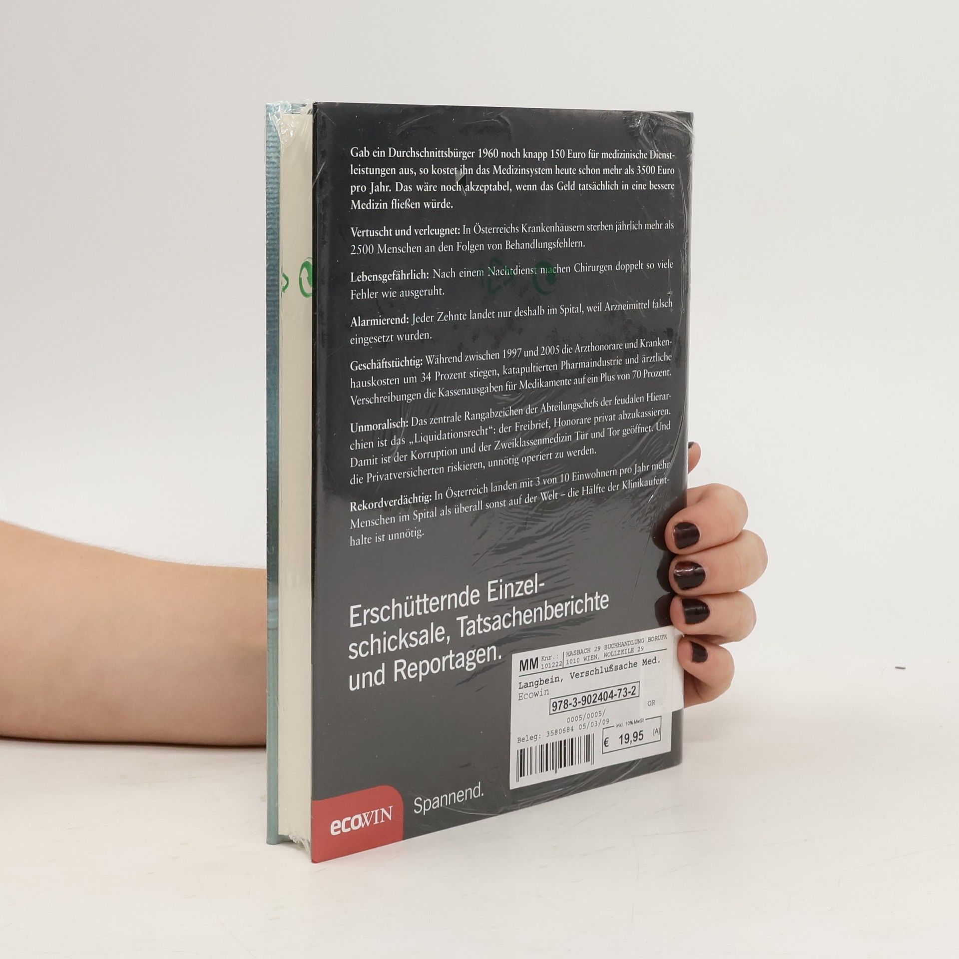 Gab ein Durchschnittsbürger 1960 noch knapp 150 Euro für medizinische Dienstleistungen aus, so kostet ihn das Medizinsystem heute schon mehr als 3500 Euro pro Jahr. Das wäre noch akzeptabel, wenn die 26 Milliarden tatsächlich in eine bessere Medizin fließen würden. Vertuscht und verleugnet: In Österreichs Krankenhäusern sterben jährlich 3000 Menschen an den Folgen von Behandlungsfehlern. Lebensgefährdend: Nach einem Nachtdienst machen Chirurgen doppelt so viele Fehler wie ausgeruht. Alarmierend: Jeder Zehnte landet nur deshalb im Spital, weil Arzneimittel falsch eingesetzt wurden. Geschäftstüchtig: Während zwischen 1997 und 2005 die Arzthonorare und Krankenhauskosten um 34 Prozent stiegen, katapultierten Pharmaindustrie und Ärzte die Kassenausgaben für Medikamente auf ein Plus von 70 Prozent. Unmoralisch: Das zentrale Rangabzeichen der Abteilungschefs der feudalen Hierarchien ist das „Liquidationsrecht“: der Freibrief, Honorare privat abzukassieren. Damit ist der Korruption und der Zweiklassenmedizin Tür und Tor geöffnet. Und die Privatversicherten riskieren, unnötig operiert zu werden. Rekordverdächtig: In Österreich landen mit 3 von 10 Einwohnern pro Jahr mehr Menschen im Spital als überall sonst auf der Welt – die Hälfte der Klinikaufenthalte ist unnötig.