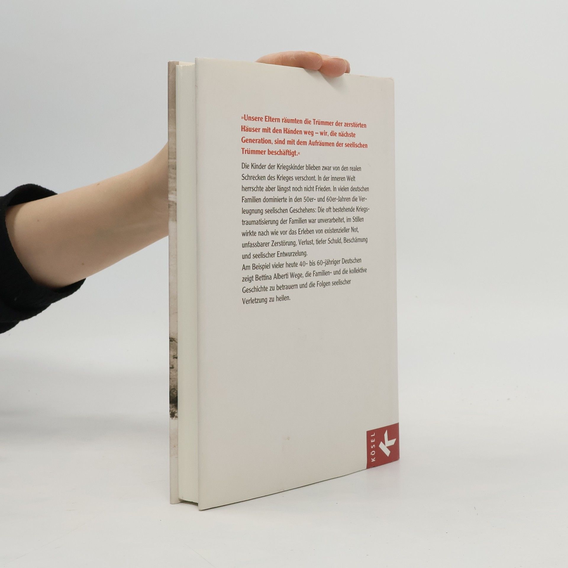 Auch 70 Jahre nach Ende des Zweiten Weltkriegs leiden noch viele Menschen unter vielfältigen Traumata. Selbst bei den Kindern der Kriegskinder zeigen sich Gefühle von Einsamkeit, Unsicherheit, Angst und Entwurzelung. Viele Beispiele von Betroffenen verdeutlichen, wie die Folgen dieser seelischen Verletzung geheilt werden können.