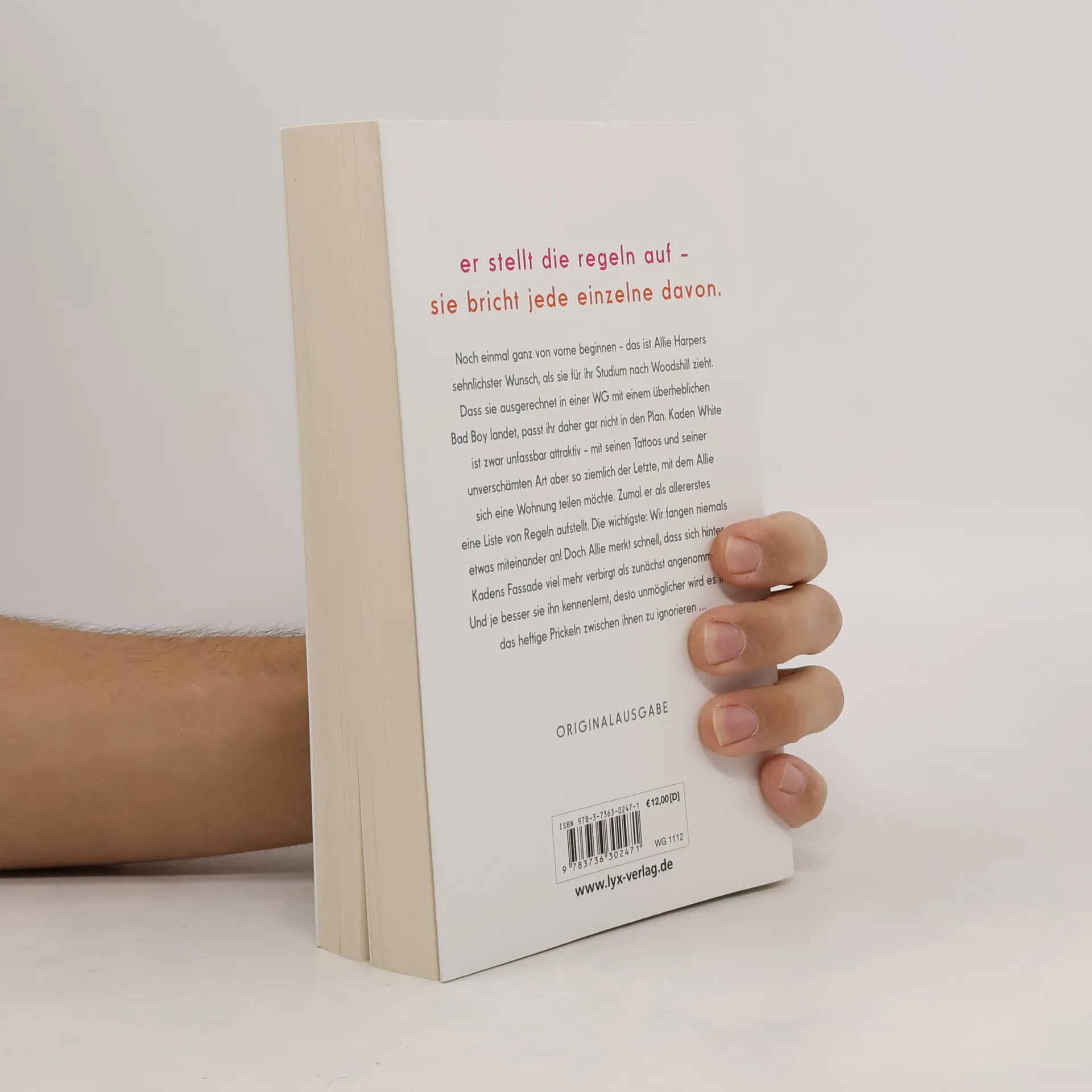 Er stellt die Regeln auf - sie bricht jede einzelne davon. Noch einmal ganz von vorne beginnen - das ist Allie Harpers sehnlichster Wunsch, als sie für ihr Studium nach Woodshill zieht. Dass sie ausgerechnet in einer WG mit einem überheblichen Bad Boy landet, passt ihr daher gar nicht in den Plan. Kaden White ist zwar unfassbar attraktiv - mit seinen Tattoos und seiner unverschämten Art aber so ziemlich der Letzte, mit dem Allie sich eine Wohnung teilen möchte. Zumal er als allererstes eine Liste von Regeln aufstellt. Die wichtigste: Wir fangen niemals etwas miteinander an! Doch Allie merkt schnell, dass sich hinter Kadens Fassade viel mehr verbirgt als zunächst angenommen. Und je besser sie ihn kennenlernt, desto unmöglicher wird es ihr, das heftige Prickeln zwischen ihnen zu ignorieren ... „Lache, weine und verliebe dich. Mona Kasten hat ein Buch geschrieben, das man nicht aus der Hand legen kann!“ ANNA TODD über „Begin Again“ Der Auftaktband der „Again“-Reihe von Platz-1-SPIEGEL-Bestseller-Autorin Mona Kasten