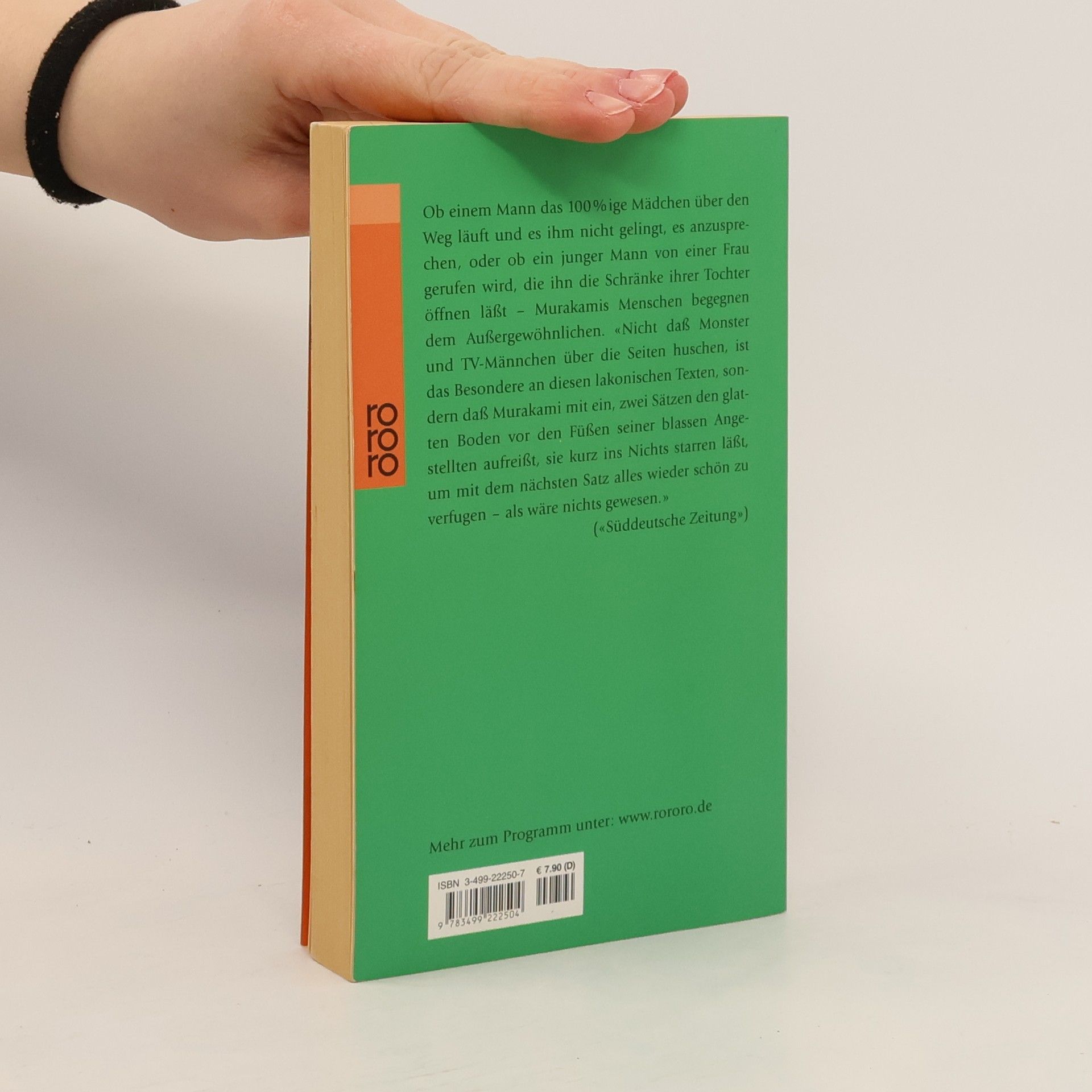Ob einem Mann das 100%ige Mädchen über den Weg läuft und es ihm nicht gelingt, es anzusprechen, oder ob ein junger Mann von einer Frau gerufen wird, die ihn die Schränke ihrer Tochter offenen läßt - Murakamis Menschen begegnen dem Außergewöhnlichen. \"Nicht daß Monster und TV-Männchen über die Seiten huschen, ist das Besondere an diesen lakonischen Texten, sondern daß Murakami mit ein, zwei Sätzen den glatten Boden vor den Füßen seiner blassen Angestellten aufreißt, sie kurz ins Nichts starren läßt, um mit dem nächsten Satz alles wieder schön zu verfugen - als wäre nichts gewesen.\" (\"Süddeutsche Zeitung\")