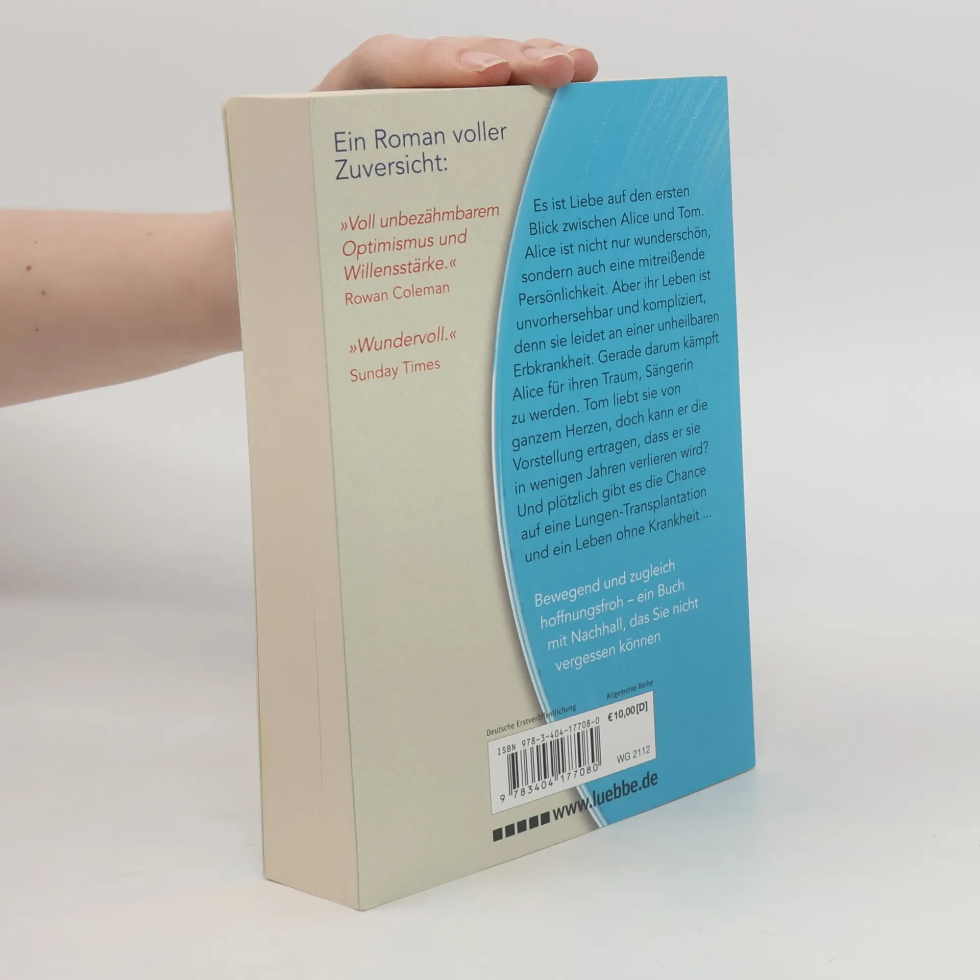 Es ist Liebe auf den ersten Blick zwischen Alice und Tom. Alice ist nicht nur wunderschön, sondern eine mitreißende Persönlichkeit. Aber ihr Leben ist unvorhersehbar und kompliziert, denn sie leidet unter einer unheilbaren Erbkrankheit. Gerade darum kämpft Alice für ihren Traum, Sängerin zu werden. Tom liebt sie von ganzem Herzen, doch kann er die Vorstellung ertragen, dass er sie in wenigen Jahren verlieren wird? Und plötzlich gibt es die Chance auf eine Lungen-Transplantation und ein Leben ohne Krankheit ...