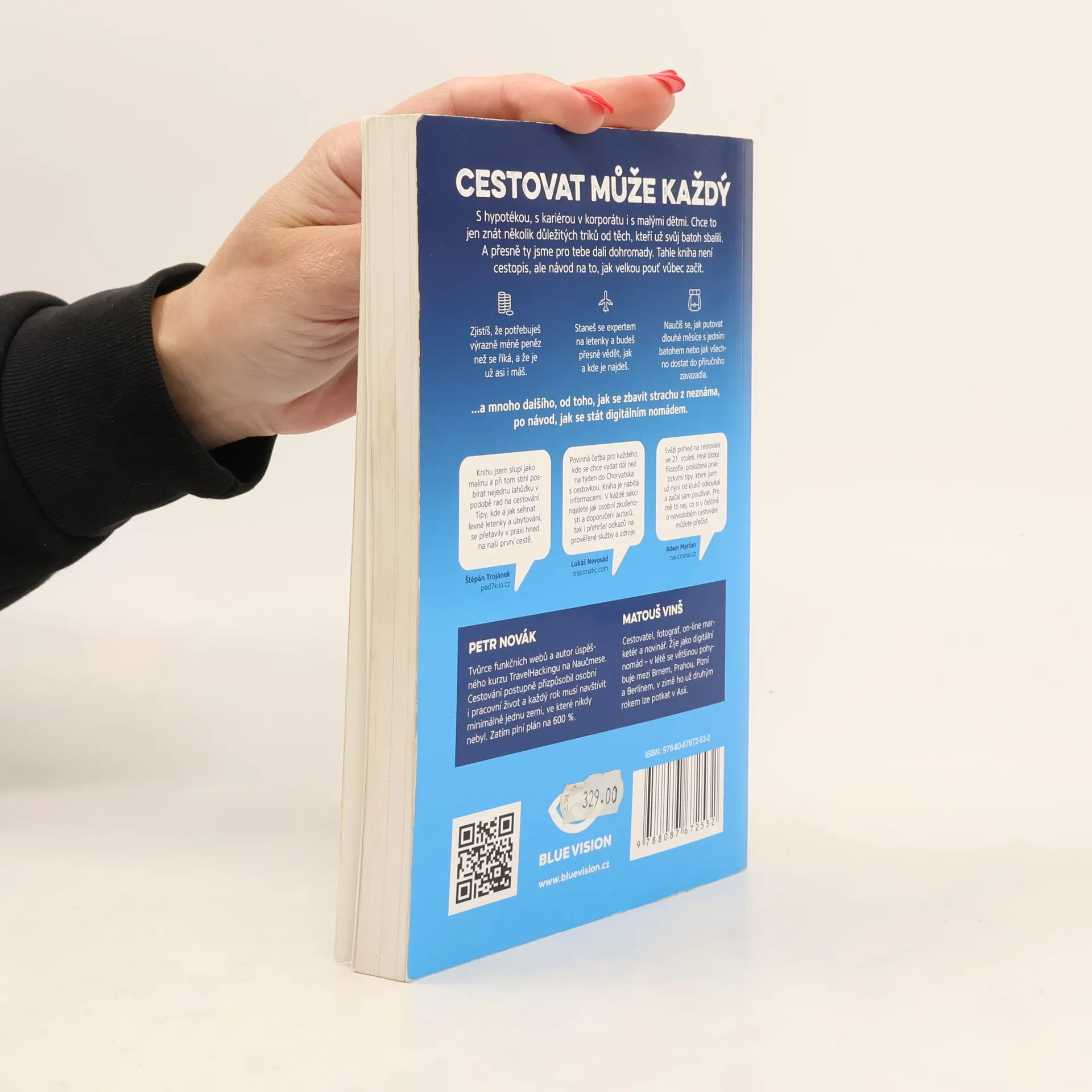 Cestovat může každý. S hypotékou, s kariérou v korporátu i s malými dětmi. Chce to jen znát pár důležitých triků od těch, kteří už svůj batoh sbalili. A přesně ty dali cestovatelé Matouš Vinš a Petr Novák v knize dohromady. Zdaleka přitom nečerpali jen z vlastních zkušeností, oslovili i mnoho ostřílených kolegů dobrodruhů a světoběžníků. Travel Bible je návod na to, jak velkou pouť vůbec začít a jak si ji naplno užít. Po jejím přečtení přestanete jen snít a skutečně vyrazíte do zemí, kam už se tak dlouho toužíte podívat. Zažijete věci, na které do konce života nezapomenete, a poznáte místa, která neuvidíte ani v National Geographic. V knize zjistíte, jak si na cestu našetřit, jak sehnat levné letenky a jak neutratit zbytečně mnoho za ubytování. Cestovat se dá i chytře, zdaleka není potřeba šetřit za každou cenu. Uvědomíte si, že nejlepší způsob je co nejvíce splynout s místními obyvateli a přestat se chovat jako turista. V druhé části knihy vám autoři přiblíží možnosti dobrovolničení a práce na cestách, přidají své zkušenosti s digitálním nomádstvím a pomůžou vám se osvobodit z klasických pracovních stereotypů. Závěr knihy věnují možnostem, jak si díky zážitkům, fotkám a videím z cest vydělat na objevování dalších zemí.