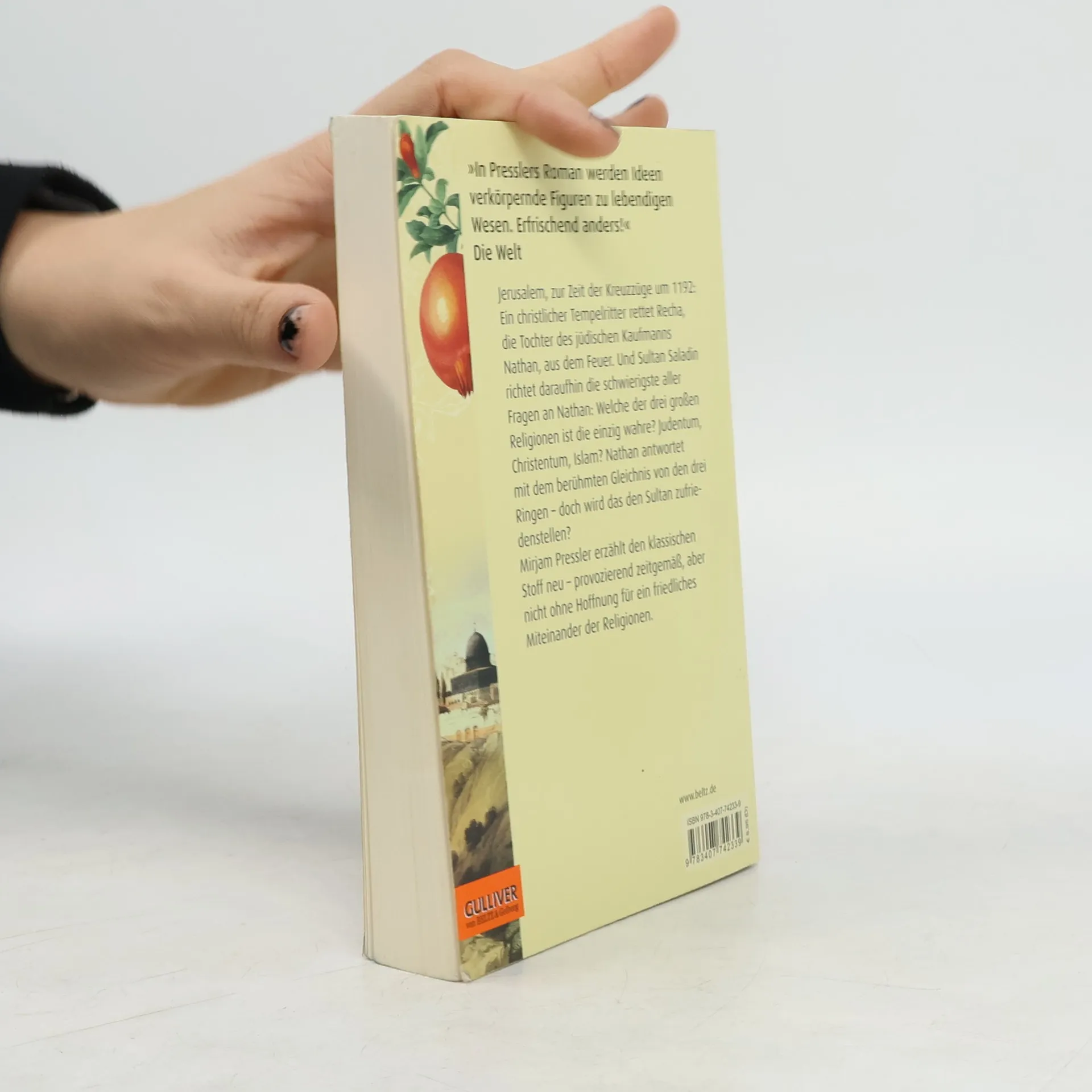 »Ein hochaktuelles, spannendes Buch über Toleranz und die Koexistenz der drei Religionen, die ja bis heute nicht gelingt.« Frankfurter Rundschau Jerusalem, zur Zeit der Kreuzzüge um 1192: Ein junger Tempelritter rettet Recha, die Tochter des jüdischen Kaufmanns Nathan, aus dem Feuer. Daraufhin richtet Sultan Saladin die schwierigste aller Fragen an Nathan: Welche Religion ist die einzig wahre? Nathan antwortet mit dem berühmten Gleichnis von den drei Ringen – doch wird das den Sultan zufriedenstellen? Außerdem ahnt Nathan nicht, dass ihm inzwischen der christliche Patriarch von Jerusalem und ein moslemischer Hauptmann nach dem Leben trachten ... Mirjam Pressler erzählt den klassischen Stoff neu – provozierend zeitgemäß, aber nicht ohne Hoffnung für ein friedliches Nebeneinander der Religionen.