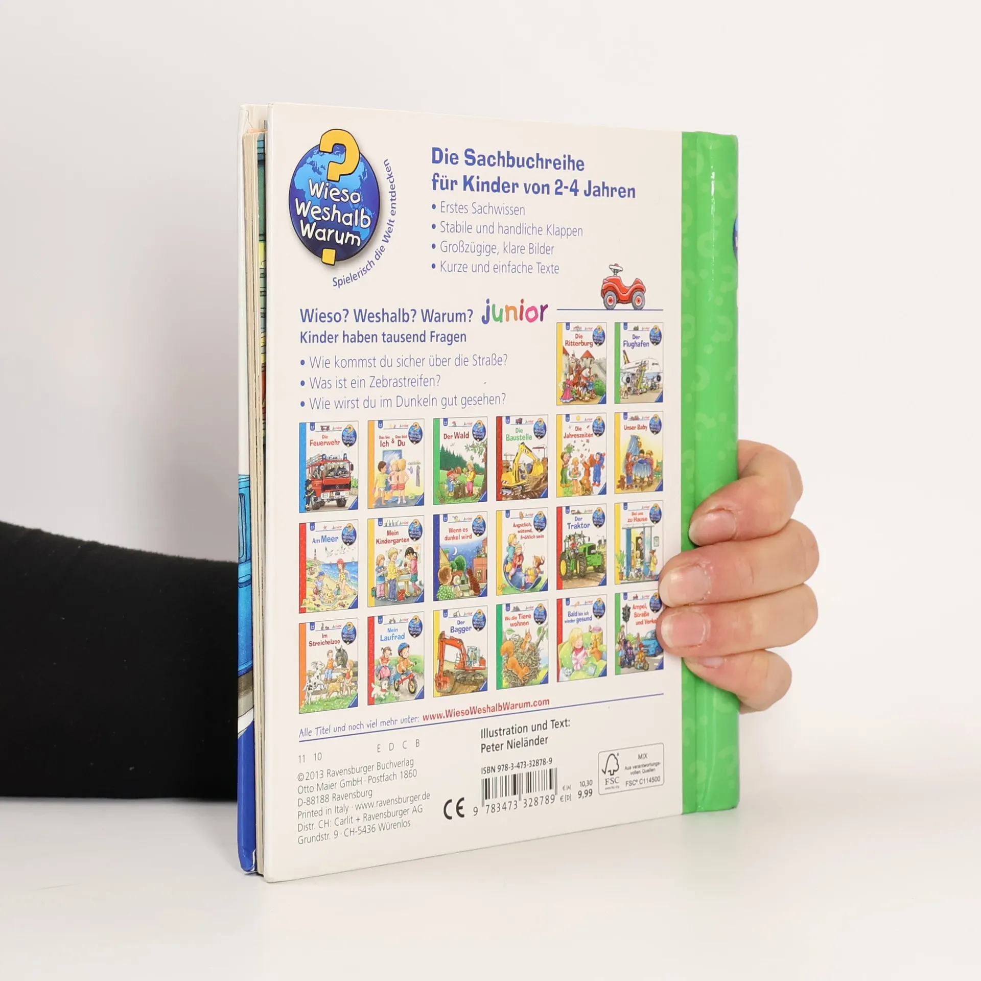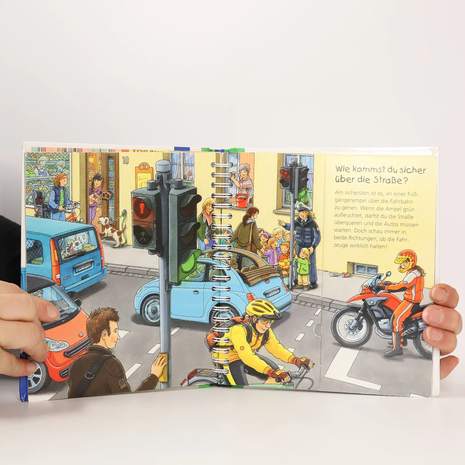 Wie überquert man eine Straße an einer Ampel oder einem Zebrastreifen? Wie wird man im Dunkeln gut gesehen? Kleine Kinder sind zwar noch nicht allein im Straßenverkehr unterwegs, trotzdem können sie in gefährliche Situationen geraten. Dieses Buch bringt ihnen anhand eindrücklicher Szenen und Bewegungsklappen die einfachsten Verhaltensregeln näher. Zum Abschluss können die Kinder in einem Richtig-Falsch-Quiz das Gelernte anwenden.