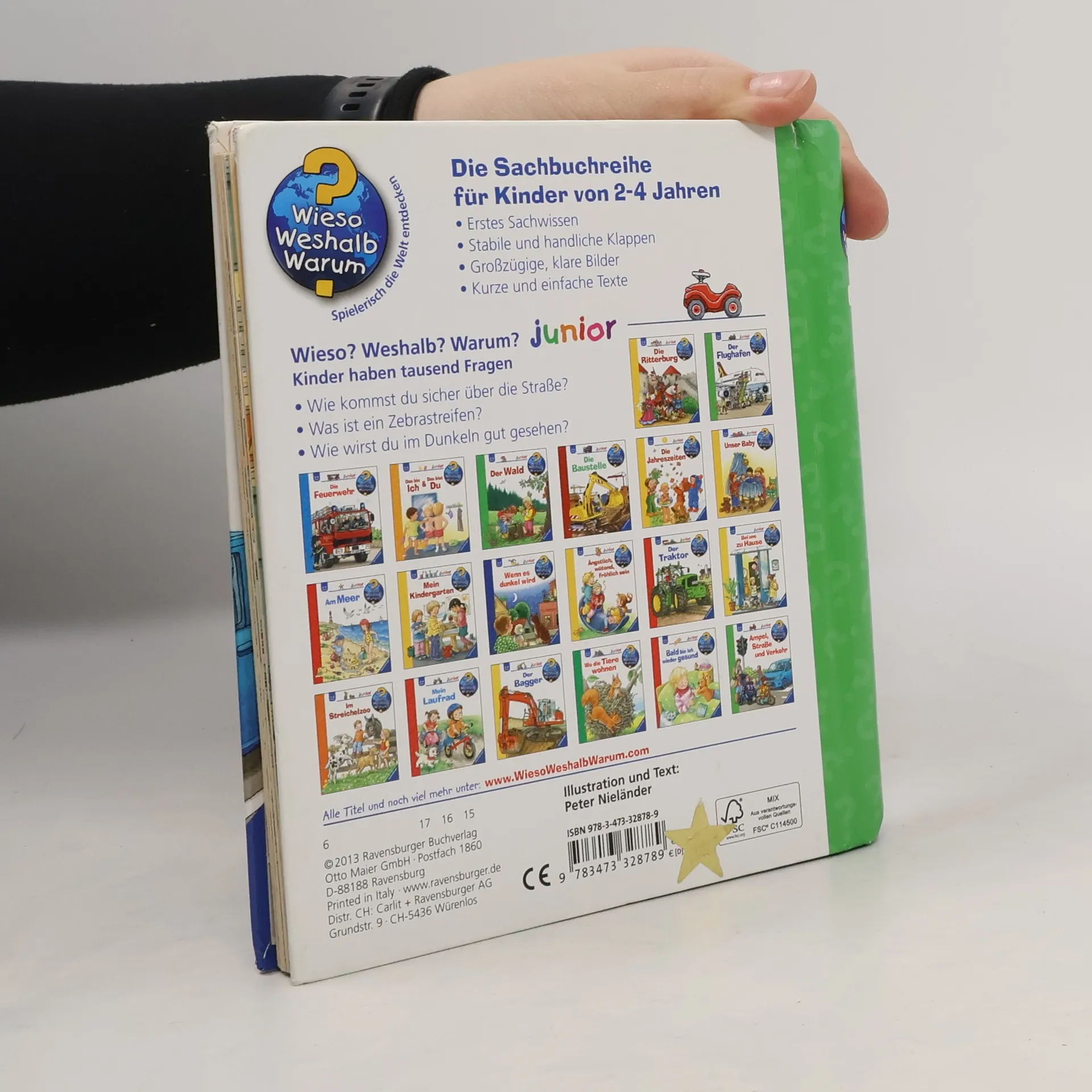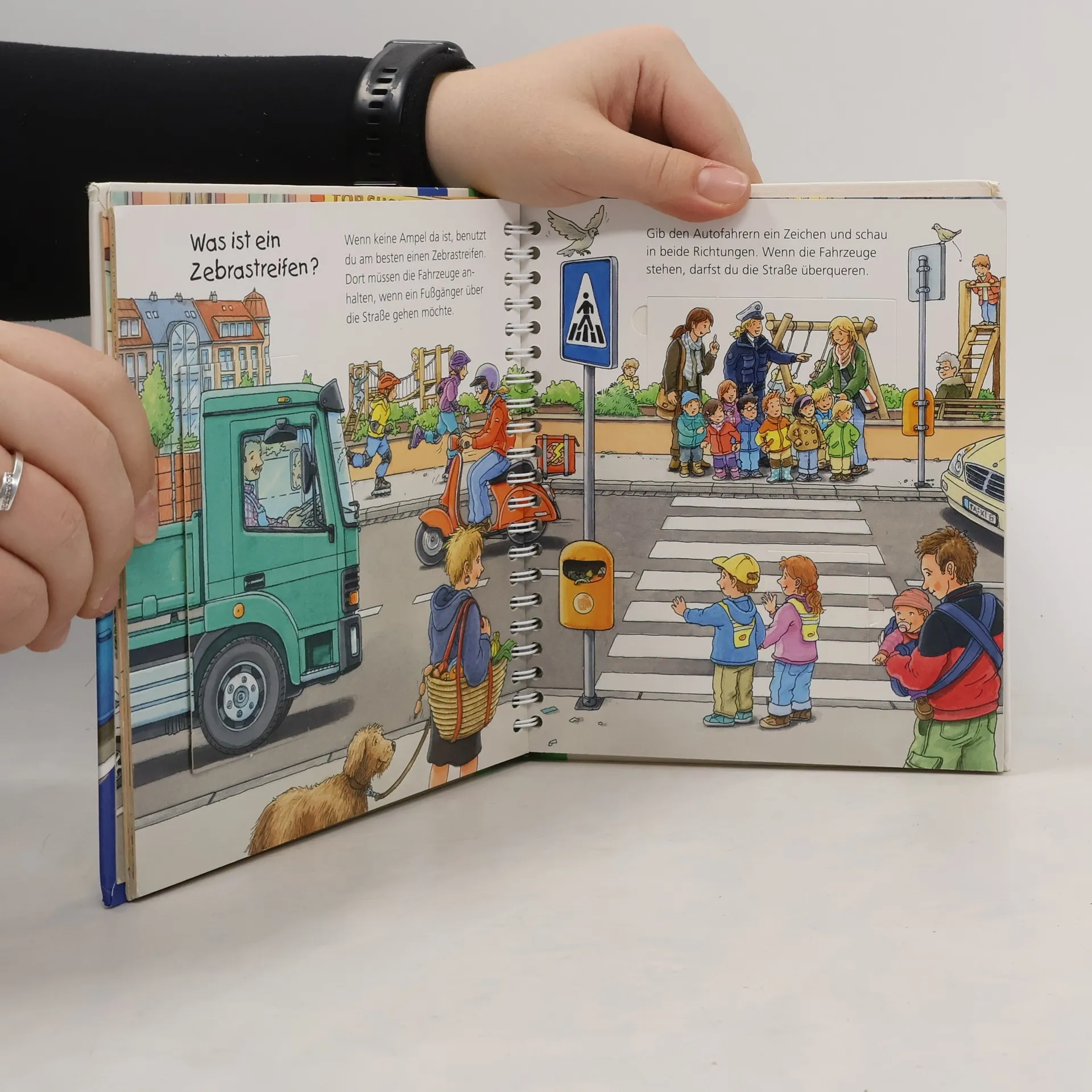 Wie überquert man eine Straße an einer Ampel oder einem Zebrastreifen? Wie wird man im Dunkeln gut gesehen? Kleine Kinder sind zwar noch nicht allein im Straßenverkehr unterwegs, trotzdem können sie in gefährliche Situationen geraten. Dieses Buch bringt ihnen anhand eindrücklicher Szenen und Bewegungsklappen die einfachsten Verhaltensregeln näher. Zum Abschluss können die Kinder in einem Richtig-Falsch-Quiz das Gelernte anwenden.