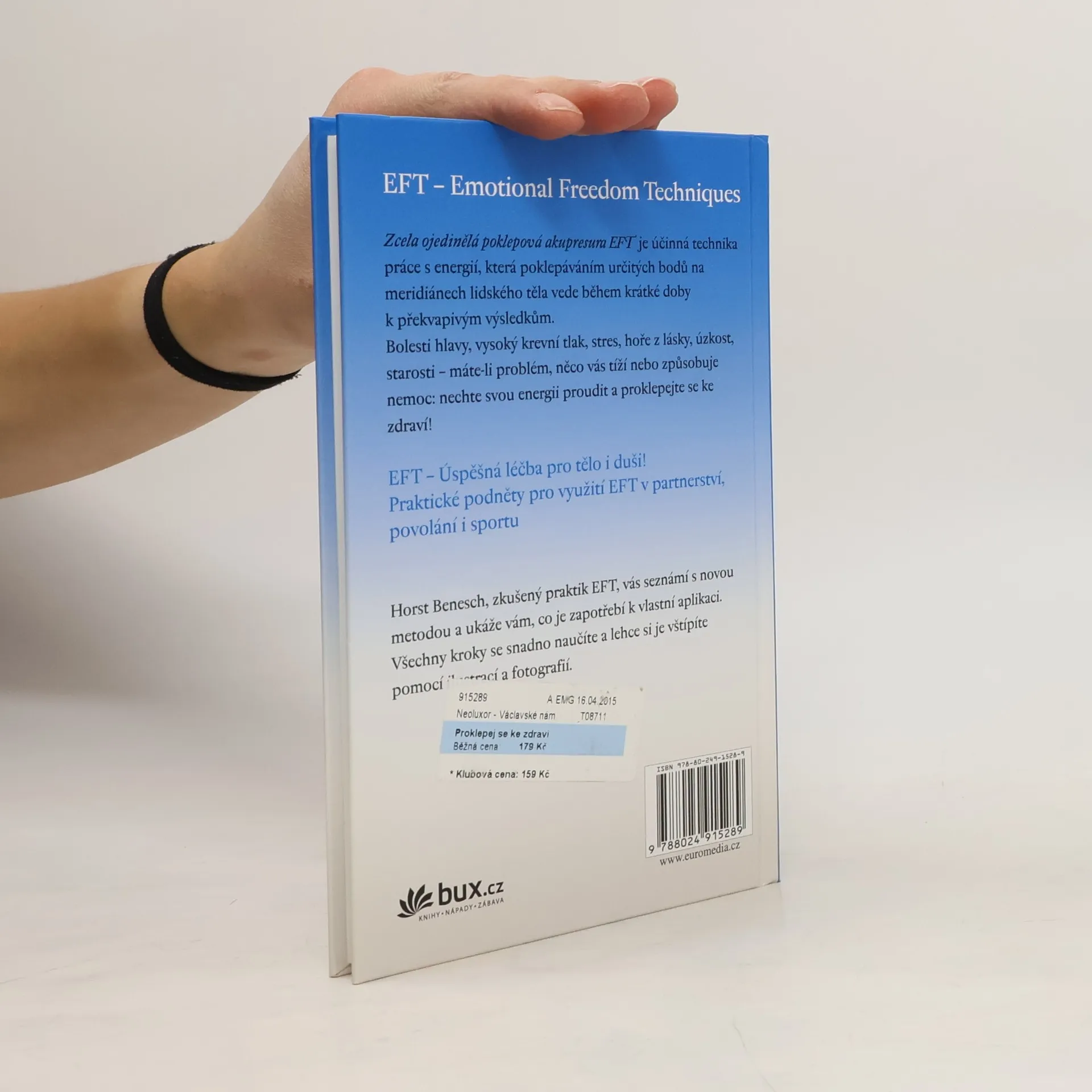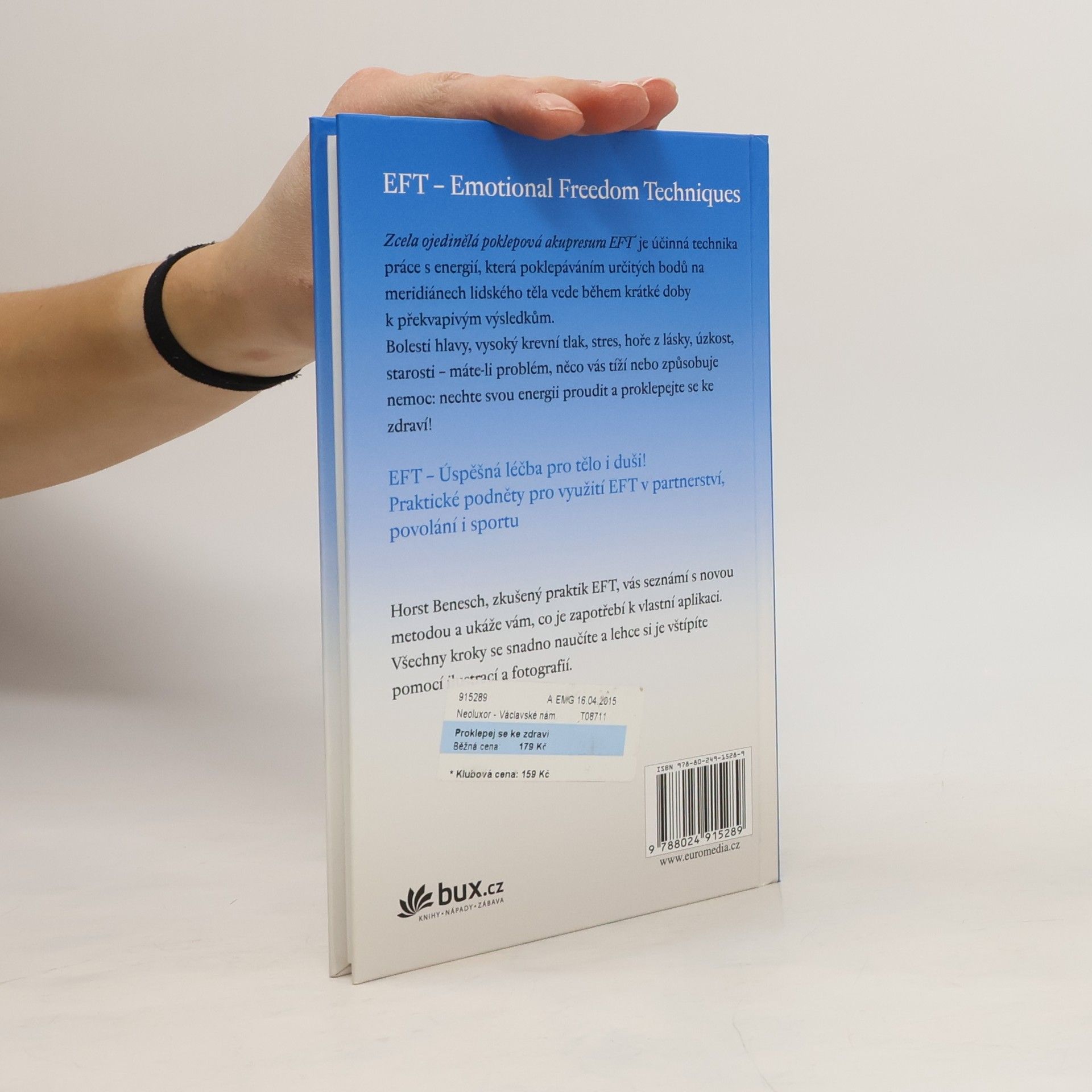 Zcela ojedinělá poklepová akupresura EFT je účinná technika práce s energií, která poklepáváním určitých bodů na meridiánech lidského těla vede během krátké doby k překvapivým výsledkům. Bolesti hlavy, vysoký krevní tlak, stres, hoře z lásky, úzkost, starosti – máte-li problém, něco vás tíží nebo způsobuje nemoc: nechte svou energii proudit a proklepejte se ke zdraví! Seznámíte se také s praktickými podněty pro využití EFT v partnerství, povolání i sportu.