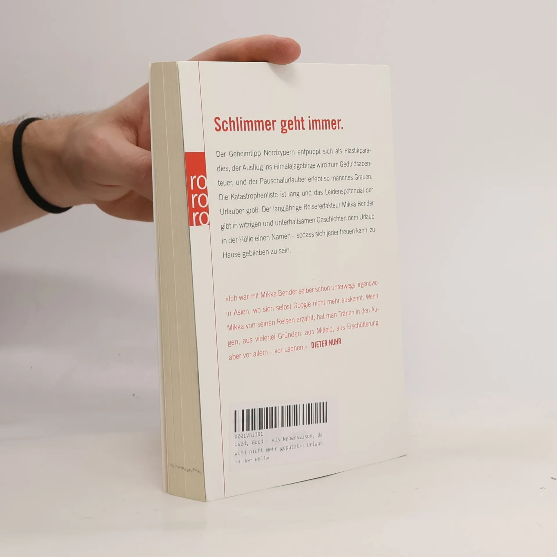 Schlimmer geht immer.Der Geheimtipp Nordzypern entpuppt sich als Plastikparadies, der Ausflug ins Himalajagebirge wird zum Geduldsabenteuer, und der Pauschalurlauber erlebt so manches Grauen. Die Katastrophenliste ist lang und das Leidenspotenzial der Urlauber groß. Der langjährige Reiseredakteur Mikka Bender gibt in witzigen und unterhaltsamen Geschichten dem Urlaub in der Hölle einen Namen – sodass sich jeder freuen kann, zu Hause geblieben zu sein.«Ich war mit Mikka Bender selber schon unterwegs, irgendwo in Asien, wo sich selbst Google nicht mehr auskennt. Wenn Mikka von seinen Reisen erzählt, hat man Tränen in den Augen, aus vielerlei Gründen: aus Mitleid, aus Erschütterung, aber vor allem – vor Lachen.» DIETER NUHR