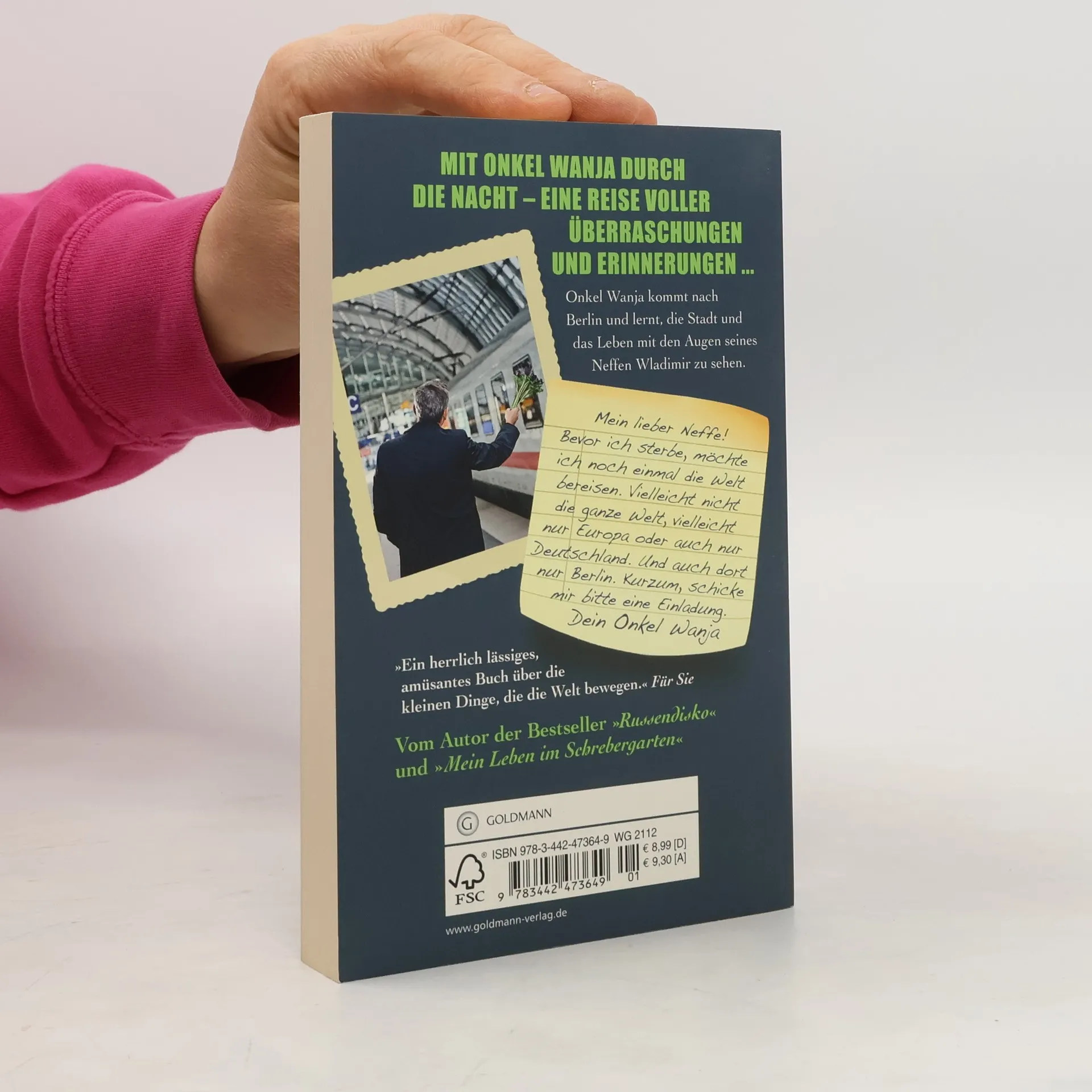 Onkel Wanja sieht sein letztes Stündlein herannahen, und er wünscht sich von seinem Neffen Wladimir nur noch eines: „Bevor ich sterbe, möchte ich noch einmal die Welt bereisen. Vielleicht nicht die ganze Welt, vielleicht nur Europa oder gar nur Deutschland. Und auch dort nur Berlin. Kurzum, schicke mir bitte eine Einladung.“ Gesagt, getan. Als Onkel Wanja in Berlin eintrifft, machen sich die beiden zu Fuß auf den Weg zu Wladimir nach Hause. Es ist ein Spaziergang durch die nächtliche Stadt voller eigentümlicher Begegnungen und unvergesslicher Betrachtungen über das Leben. Was ist gut, was böse? Was bleibt irgendwann von uns? Warum leuchtet die Hose des Onkels im Dunkeln? Und wo gibt es eigentlich die besten Matjes?