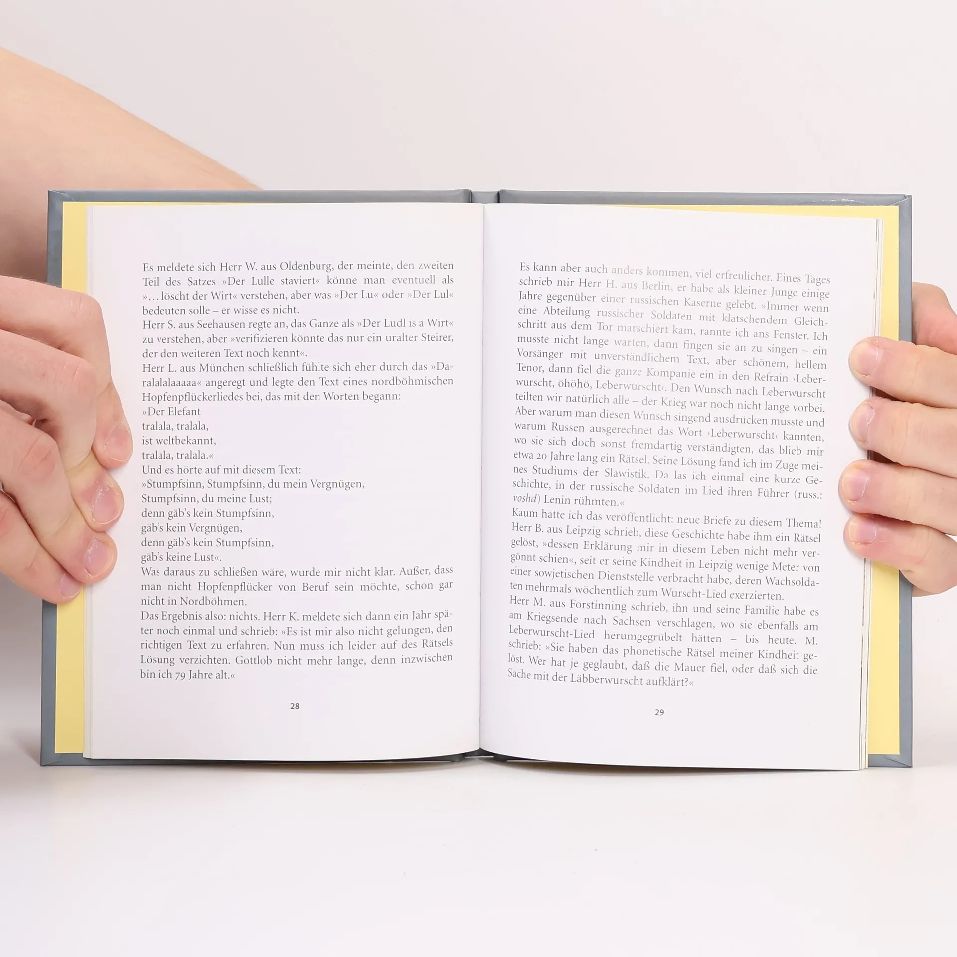 "Seit ich das erste Mal darüber schrieb, wie sehr Menschen Liedtexte falsch verstehen - wie etwa in eines Lesers Ohren Matthias Claudius' Zeile ›der weiße Nebel wunderbar‹ zu ›der weiße Neger Wumbaba‹ wurde und so eine unvergessliche, radikal poetische Traumgestalt entstand, deren Schöpfung Claudius selbst wohl nicht möglich war - erreichte mich eine solche Flut von Leserbriefen, gefüllt mit Beispielen für falsch verstandene Liedtexte, dass ich nun der Meinung bin: Im Grunde versteht kaum ein Mensch je einen Liedtext richtig, ja Liedtexte sind überhaupt nur dazu da, falsch verstanden zu werden. Aufgabe eines Liedtexters ist es, den Menschen Material zu liefern, damit ihre Phantasie wirken kann …"