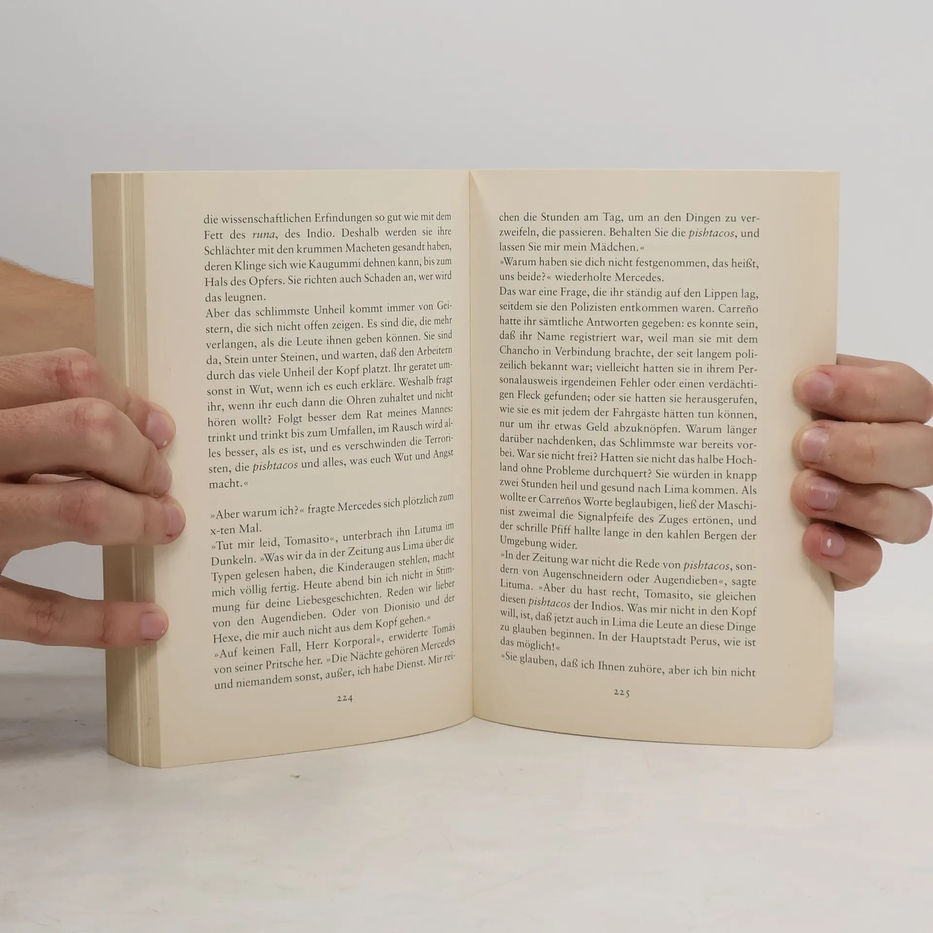 Auf ihrem Posten in den peruanischen Anden sitzen Korporal Lituma und sein Helfer Tomás wie in einer Falle. Unter ständiger Bedrohung durch Terrorkommandos und eine gewalttätige Natur sollen sie das mysteriöse Verschwinden dreier Menschen aufklären. Überall schlägt ihnen Mißtrauen entgegen, unheimliche Geschichten dringen an ihr Ohr. Hätte Tomás nicht die brennende Erinnerung an seine abenteuerliche Liebesgeschichte mit Mercedes, von der er Lituma Nacht für Nacht erzählt, die beiden müßten eingehen in dieser feindseligen, abergläubischen Bergwelt.So abweisend das Klima und so verstörend die Bruchstücke der Wahrheit, die sie nach und nach ans Licht bringen, sie lassen nicht locker. Was in den Bergen geschah, hat die Ausmaße eines unfaßbaren Dramas.