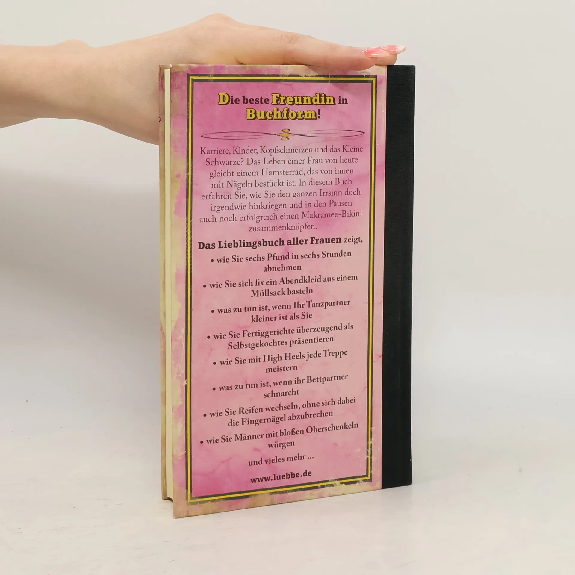 Karriere, Kinder, Kopfschmerzen und das Kleine Schwarze? Das Leben einer Frau von heute gleicht einem Hamsterrad, das von innen mit Nägeln bestückt ist. In diesem Buch erfahren Sie, wie Sie den ganzen Irrsinn doch irgendwie hinkriegen und in den Pausen auch noch erfolgreich einen Makramee-Bikini zusammenknüpfen. Das Lieblingsbuch aller Frauen zeigt, wie Sie sechs Pfund in sechs Stunden abnehmen, wie Sie sich fix ein Abendkleid aus einem Müllsack basteln, was zu tun ist, wenn Ihr Tanzpartner kleiner ist als Sie, wie Sie Fertiggerichte überzeugend als Selbstgekochtes präsentieren, wie Sie mit High Heels jede Treppe meistern, was zu tun ist, wenn ihr Bettpartner schnarcht, wie Sie Reifen wechseln, ohne sich dabei die Fingernägel abzubrechen, wie Sie Männer mit bloßen Oberschenkeln würgen und vieles mehr.