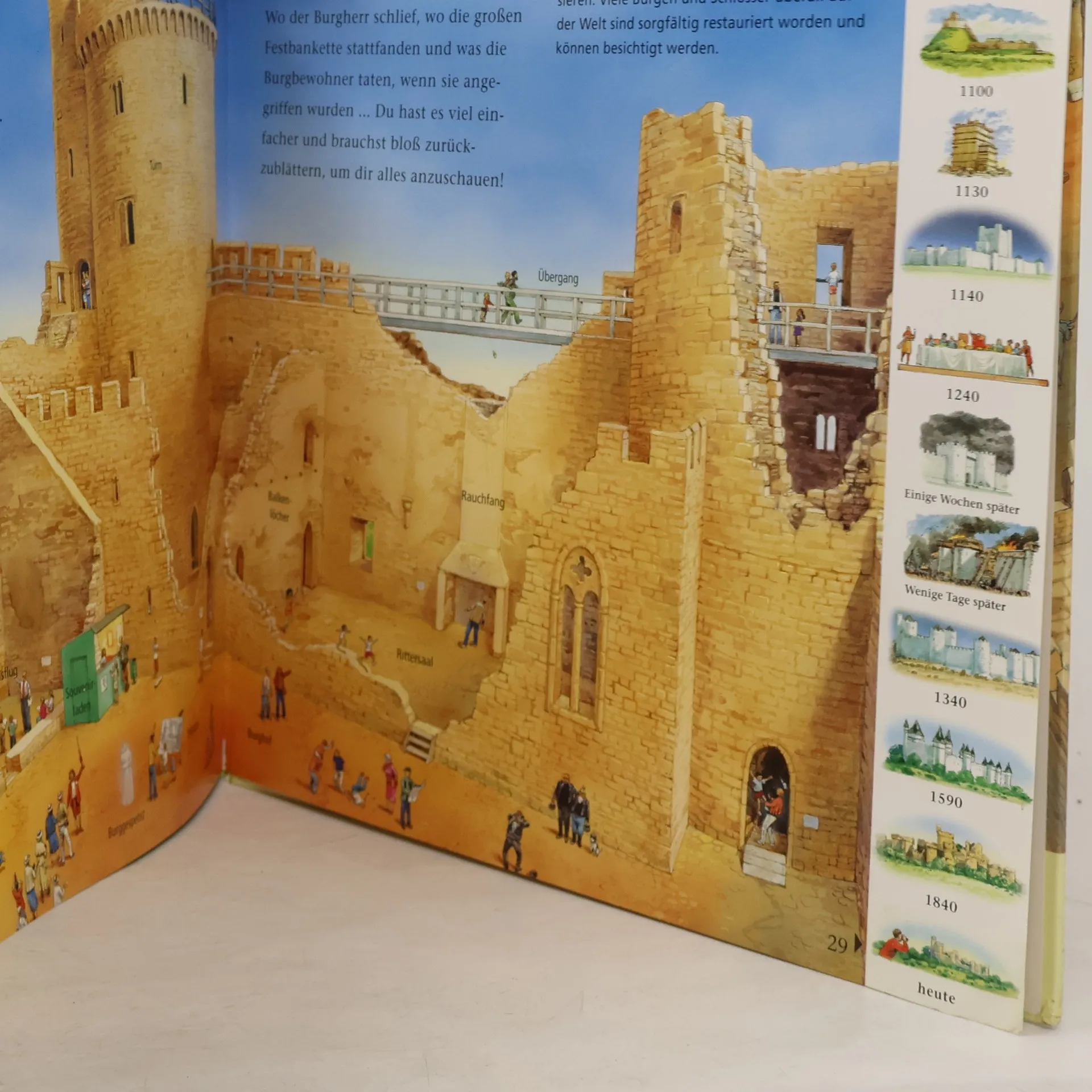 Die ereignisreiche Geschichte einer Burg erzählt von Kelten und Römern, von Rittern und Burgherren, von Belagerung, Zerstörung und Wiederaufbau. Hier wird Geschichte lebendig! Die Reihe „Abenteuer Zeitreise“ entführt uns zu aufregenden Plätzen und packenden Ereignissen in der Vergangenheit. Die spannende Reise beginnt Jahrtausende vor unserer Zeit und endet in der Gegenwart. Großformatige Panoramabilder zeigen die unterschiedlichen Gesichter der Orte im Wandel der Zeit und laden zum Suchen und Entdecken ein. Mit der übersichtlichen Griffleiste am Rand sind gezielte Zeitsprünge ein Kinderspiel.