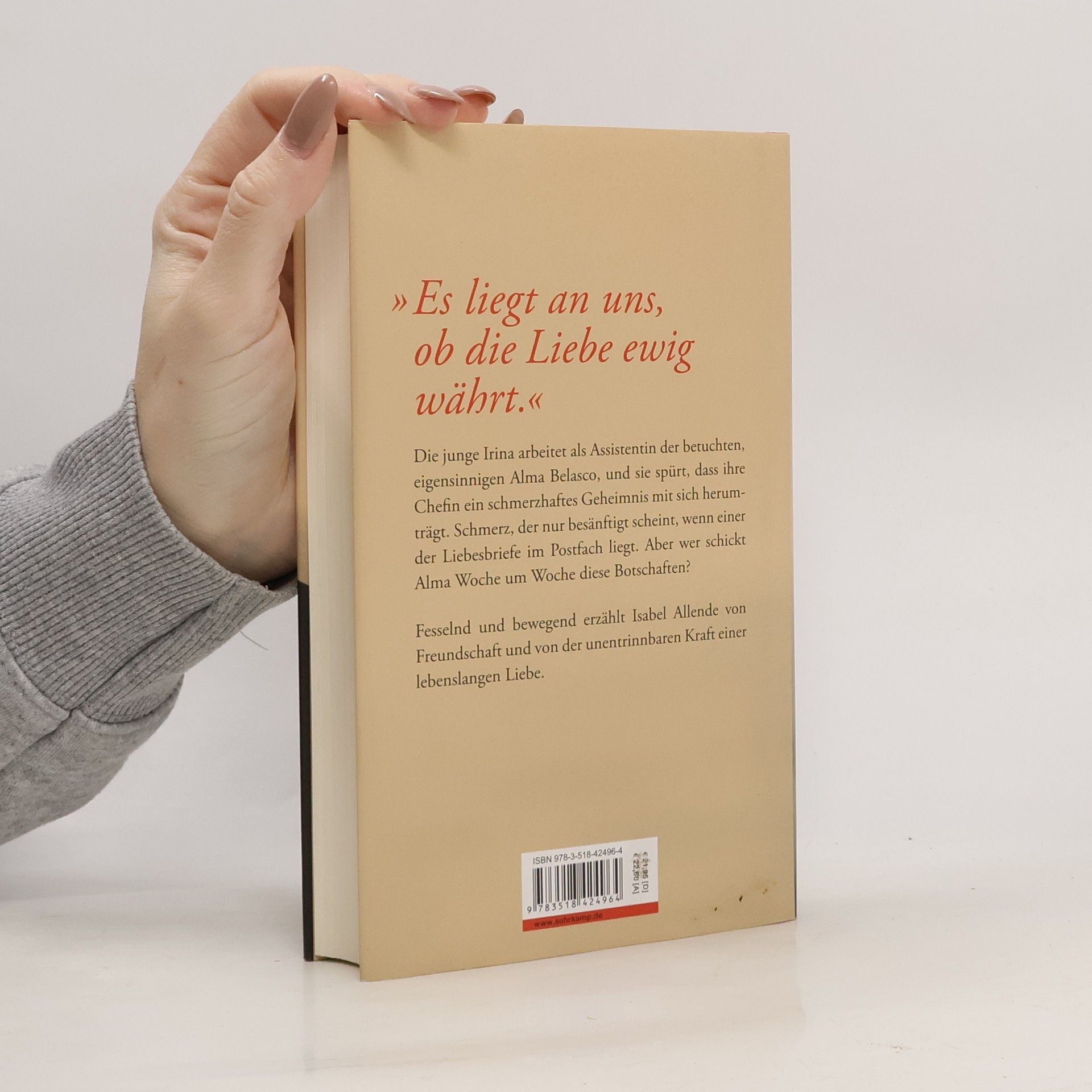 Isabel Allende auf dem Höhepunkt ihres Schaffens »Es liegt an uns, ob die Liebe ewig währt.« Für Irina ist der neue Job ein Glücksfall. Die junge Frau soll für die Millionärin Alma Belasco als Assistentin arbeiten. Mit einem Schlag ist sie nicht nur ihre Geldsorgen los, sondern gewinnt auch eine Freundin, wie sie noch keine hatte: extravagant, überbordend, mitreißend und an die achtzig. Doch bald spürt sie, dass Alma verwundet ist. Eine Wunde, die nur vergessen scheint, wenn eines der edlen Kuverts im Postfach liegt. Aber wer schreibt Woche um Woche diese Liebesbriefe? Und von wem stammen all die Blumen? Auch um sich von den eigenen Lebenssorgen abzulenken, folgt Irina den Spuren, und es beginnt eine abenteuerliche Reise bis weit in die Vergangenheit. Isabel Allende erzählt von Freundschaft und der unentrinnbaren Kraft einer lebenslangen Liebe. Davon, wie Zeit und Zwänge über eine solche Liebe hinweggehen und sie verwandeln, in Verbundenheit, Wehmut und ein leises Staunen – darüber, schon so lange gemeinsam unterwegs zu sein.