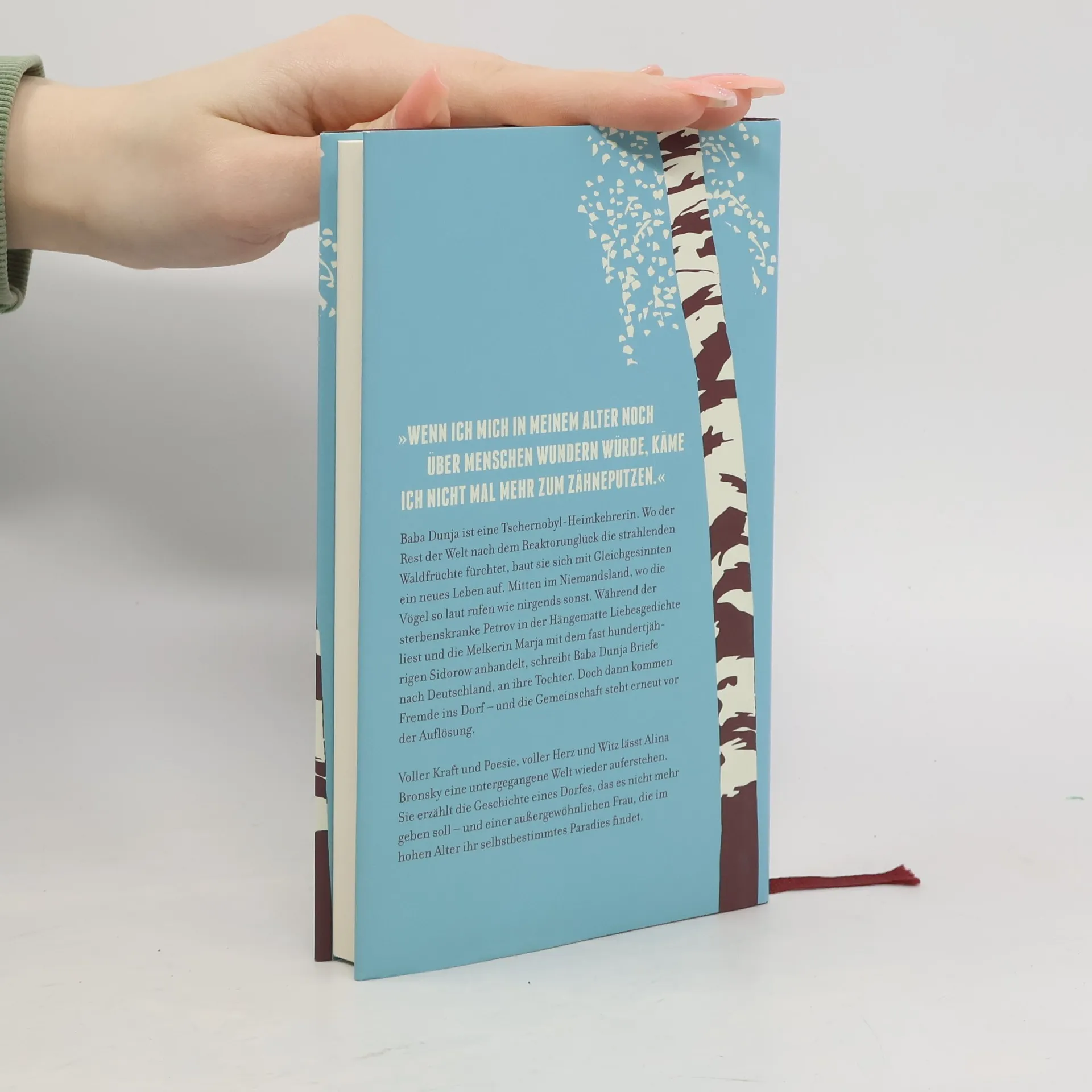 »Wenn ich mich in meinem Alter noch über Menschen wundern würde, käme ich nicht mehr zum Zähneputzen.« Alina Bronsky lässt in ihrem neuen Roman eine untergegangene Welt wieder auferstehen. Komisch, klug und herzzerreißend erzählt sie die Geschichte eines Dorfes, das es nicht mehr geben soll – und einer außergewöhnlichen Frau, die im hohen Alter ihr selbstbestimmtes Paradies findet. Baba Dunja ist eine Tschernobyl-Heimkehrerin. Wo der Rest der Welt nach dem Reaktorunglück die tickenden Geigerzähler und die strahlenden Waldfrüchte fürchtet, baut sich die ehemalige Krankenschwester mit Gleichgesinnten ein neues Leben im Niemandsland auf. Wasser gibt es aus dem Brunnen, Elektrizität an guten Tagen und Gemüse aus dem eigenen Garten. Die Vögel rufen so laut wie nirgends sonst, die Spinnen weben verrückte Netze, und manchmal kommt ein Toter auf einen Plausch vorbei. Während der sterbenskranke Petrov in der Hängematte Liebesgedichte liest und die Melkerin Marja mit dem fast hundertjährigen Sidorow anbandelt, schreibt Baba Dunja Briefe an ihre Tochter Irina, die Chirurgin bei der deutschen Bundeswehr ist. Doch dann kommt ein Fremder ins Dorf – und die Gemeinschaft steht erneut vor der Auflösung. Auf kleinem Raum gelingt Alina Bronsky voller Kraft und Poesie, voller Herz und Witz eine märchenhafte und zugleich fesselnd gegenwärtige Geschichte.