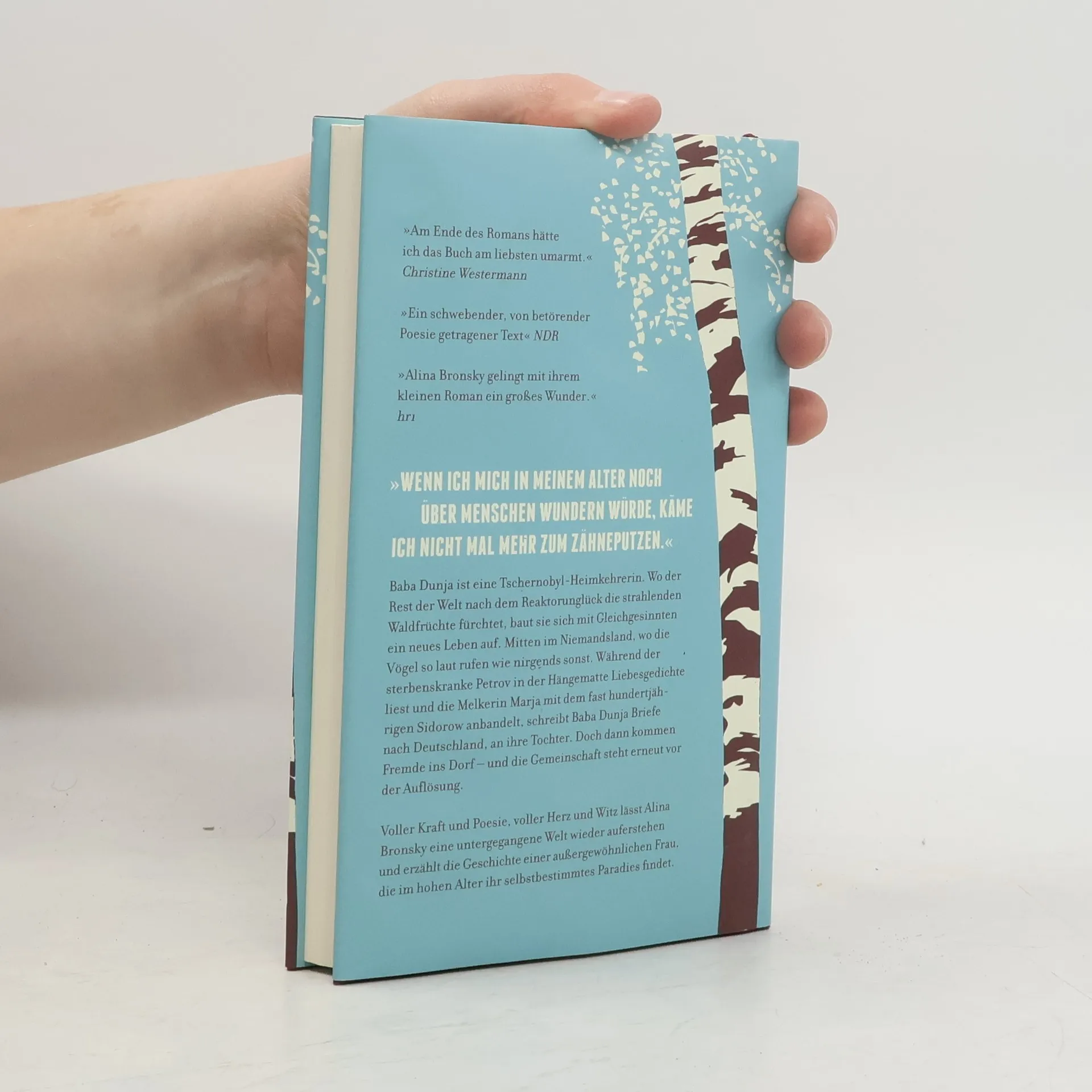 »Wenn ich mich in meinem Alter noch über Menschen wundern würde, käme ich nicht mehr zum Zähneputzen.« Alina Bronsky lässt in ihrem neuen Roman eine untergegangene Welt wieder auferstehen. Komisch, klug und herzzerreißend erzählt sie die Geschichte eines Dorfes, das es nicht mehr geben soll – und einer außergewöhnlichen Frau, die im hohen Alter ihr selbstbestimmtes Paradies findet. Baba Dunja ist eine Tschernobyl-Heimkehrerin. Wo der Rest der Welt nach dem Reaktorunglück die tickenden Geigerzähler und die strahlenden Waldfrüchte fürchtet, baut sich die ehemalige Krankenschwester mit Gleichgesinnten ein neues Leben im Niemandsland auf. Wasser gibt es aus dem Brunnen, Elektrizität an guten Tagen und Gemüse aus dem eigenen Garten. Die Vögel rufen so laut wie nirgends sonst, die Spinnen weben verrückte Netze, und manchmal kommt ein Toter auf einen Plausch vorbei. Während der sterbenskranke Petrov in der Hängematte Liebesgedichte liest und die Melkerin Marja mit dem fast hundertjährigen Sidorow anbandelt, schreibt Baba Dunja Briefe an ihre Tochter Irina, die Chirurgin bei der deutschen Bundeswehr ist. Doch dann kommt ein Fremder ins Dorf – und die Gemeinschaft steht erneut vor der Auflösung. Auf kleinem Raum gelingt Alina Bronsky voller Kraft und Poesie, voller Herz und Witz eine märchenhafte und zugleich fesselnd gegenwärtige Geschichte.