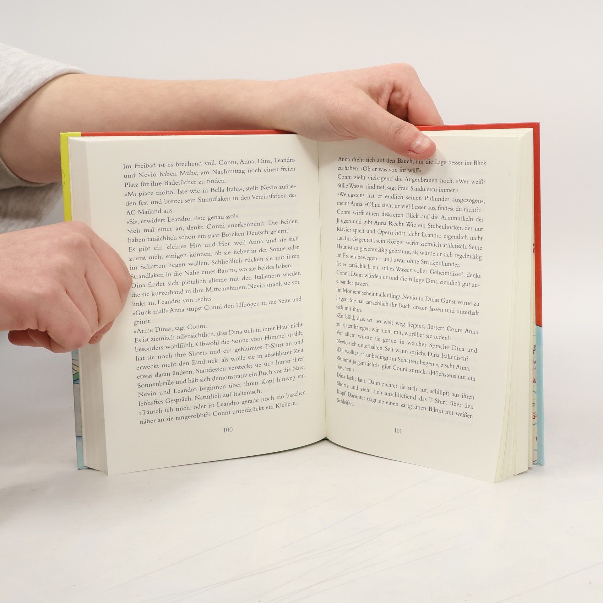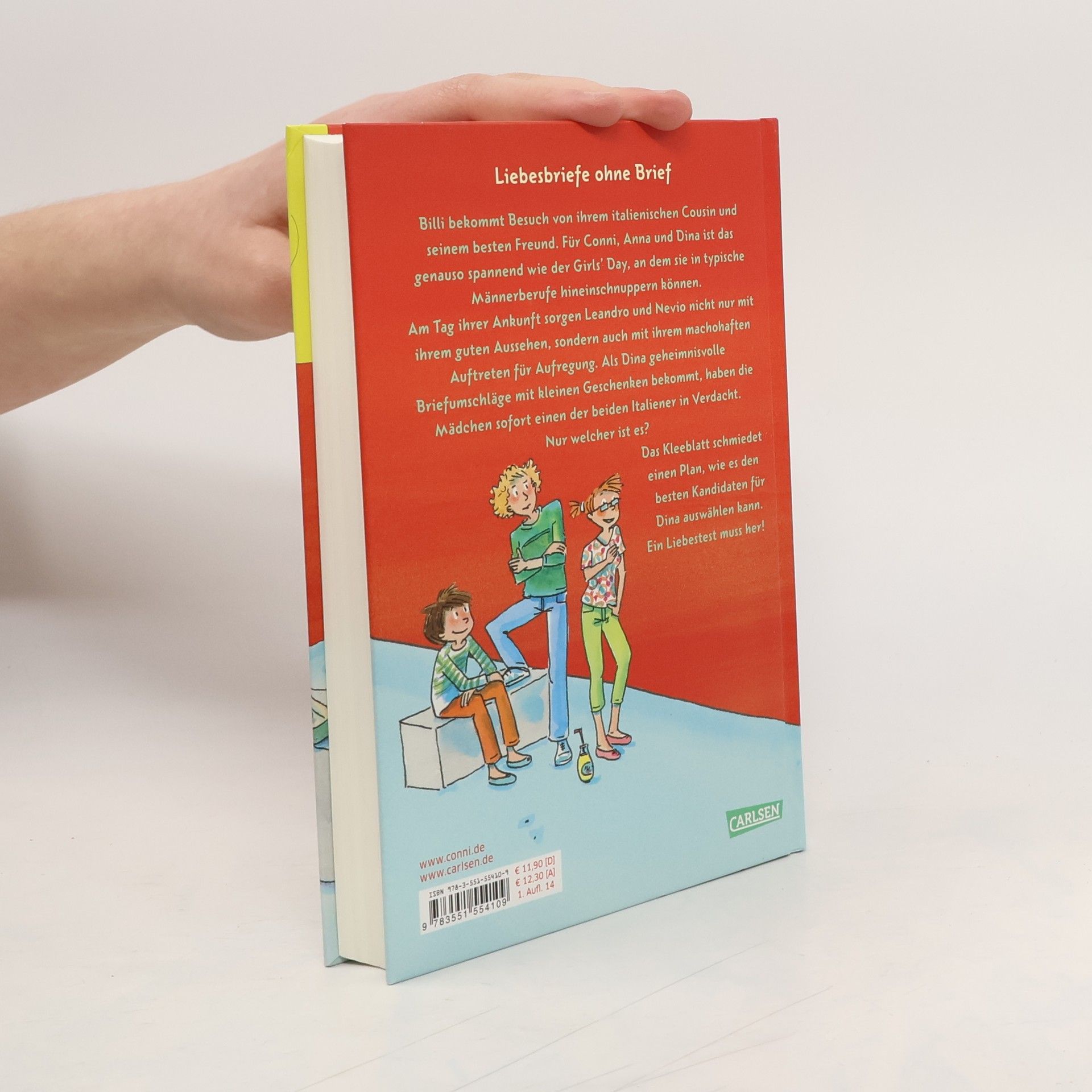 Billi bekommt Besuch von ihrem italienischen Cousin und seinem besten Freund. Für Conni, Anna und Dina ist das genauso aufregend wie der bevorstehende Girls´ Day, an dem sie in typische Männerberufe hineinschnuppern können. Am Tag ihrer Ankunft sorgen Leandro und Nevio nicht nur mit ihrem guten Aussehen, sondern auch mit ihrem machohaften Auftreten für Aufregung. Als Dina geheimnisvolle Briefumschläge mit kleinen Geschenken bekommt, haben die Mädchen sofort einen der beiden Italiener in Verdacht. Nur welcher ist es? Das Kleeblatt schmiedet einen Plan, wie es die ernsthaften Absichten der Jungs überprüfen und den besten Kandidaten für Dina auswählen kann. Ein Liebestest muss her!
