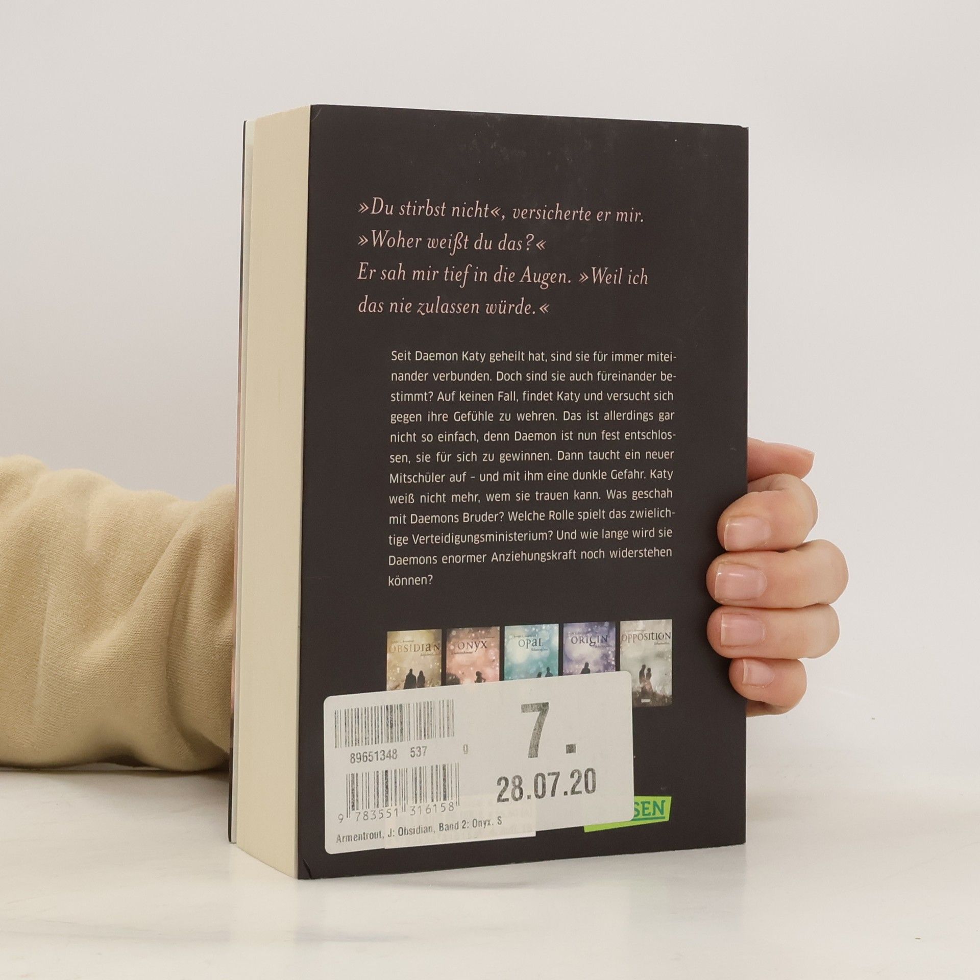 Seit Daemon Katy geheilt hat, sind sie für immer miteinander verbunden. Doch heißt das, dass sie auch füreinander bestimmt sind? Auf keinen Fall, findet Katy und versucht sich gegen ihre Gefühle zu wehren. Das ist allerdings gar nicht so einfach, denn Daemon ist nun fest entschlossen, sie für sich zu gewinnen. Dann taucht ein neuer Mitschüler auf – und mit ihm eine dunkle Gefahr. Katy weiß nicht mehr, wem sie trauen kann. Was geschah mit Daemons Bruder? Welche Rolle spielt das zwielichtige Verteidigungsministerium? Und wie lange wird sie Daemons enormer Anziehungskraft noch widerstehen können? Dies ist der zweite Band der Obsidian-Serie von Jennifer L. Armentrout. Alle Bände der unwiderstehlichen Bestsellerserie:Obsidian. SchattendunkelOnyx. SchattenschimmerOpal. SchattenglanzOrigin. SchattenfunkeOpposition. Schattenblitz Alle Bände der dazugehörigen Oblivion-Serie:Oblivion 1: Lichtflüstern (Obsidian aus Daemons Sicht erzählt)Oblivion 2: Lichtflimmern (Onyx aus Daemons Sicht erzählt)Oblivion 3: Lichtflackern (Opal aus Daemons Sicht erzählt) Alle bisher erschienenen Bände der Spin-off-Serie »Revenge«:Revenge. SternensturmRebellion. SchattensturmRedemption. Nachtsturm