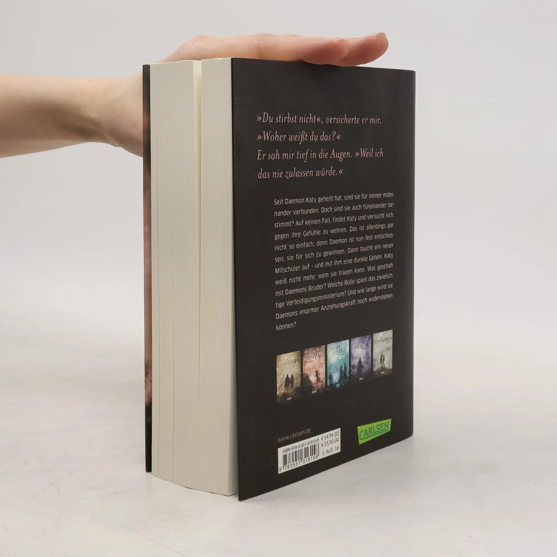 Seit Daemon Katy geheilt hat, sind sie für immer miteinander verbunden. Doch heißt das, dass sie auch füreinander bestimmt sind? Auf keinen Fall, findet Katy und versucht sich gegen ihre Gefühle zu wehren. Das ist allerdings gar nicht so einfach, denn Daemon ist nun fest entschlossen, sie für sich zu gewinnen. Dann taucht ein neuer Mitschüler auf – und mit ihm eine dunkle Gefahr. Katy weiß nicht mehr, wem sie trauen kann. Was geschah mit Daemons Bruder? Welche Rolle spielt das zwielichtige Verteidigungsministerium? Und wie lange wird sie Daemons enormer Anziehungskraft noch widerstehen können? Dies ist der zweite Band der Obsidian-Serie von Jennifer L. Armentrout. Alle Bände der unwiderstehlichen Bestsellerserie:Obsidian. SchattendunkelOnyx. SchattenschimmerOpal. SchattenglanzOrigin. SchattenfunkeOpposition. Schattenblitz Alle Bände der dazugehörigen Oblivion-Serie:Oblivion 1: Lichtflüstern (Obsidian aus Daemons Sicht erzählt)Oblivion 2: Lichtflimmern (Onyx aus Daemons Sicht erzählt)Oblivion 3: Lichtflackern (Opal aus Daemons Sicht erzählt) Alle bisher erschienenen Bände der Spin-off-Serie »Revenge«:Revenge. SternensturmRebellion. SchattensturmRedemption. Nachtsturm