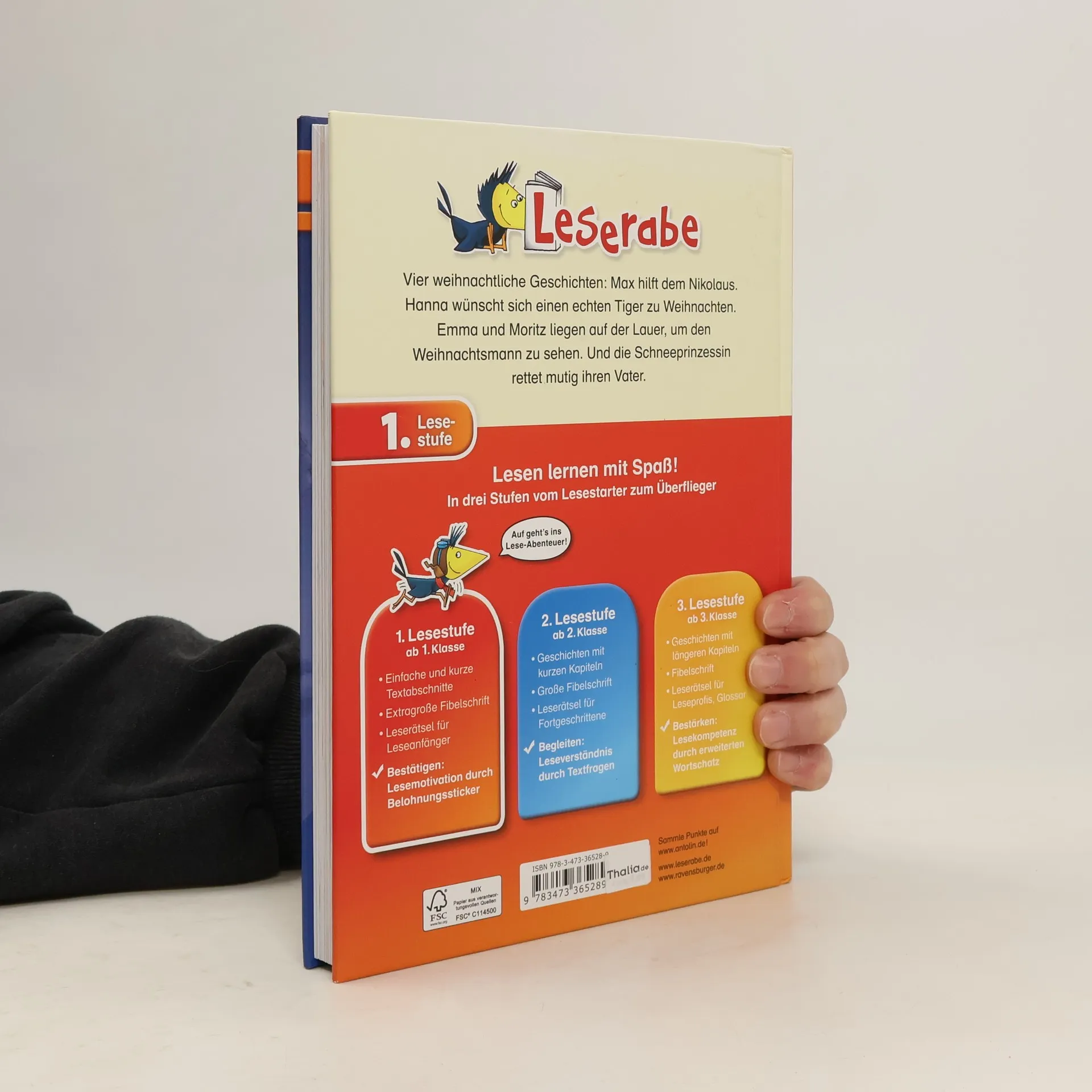 Vier bezaubernde Weihnachtsgeschichten in einem Band: Max hilft dem Nikolaus, seinen Mantel zu flicken, und Hanna wünscht sich nichts sehnlicher als einen echten Tiger zu Weihnachten. Die Zwillinge Emma und Moritz liegen auf der Lauer, um endlich einmal den Weihnachtsmann zu sehen, der überraschenderweise vom Weihnachtshasen vertreten wird. Und die Schneeprinzessin will ihren Vater befreien, der von der Eishexe Saria entführt wurde. Lesen lernen wie im Flug! Die Kinderbücher der Reihe Leserabe – 1. Lesestufe wurden mit Pädagogen entwickelt und richten sich an Leseanfänger ab der 1. Klasse. Kurze Texte in großer Fibelschrift sichern erste Leseerfolge und steigern die Lesekompetenz von Mädchen und Jungen ab 6 Jahren. Empfohlen von Stiftung Lesen, gelistet bei Antolin.