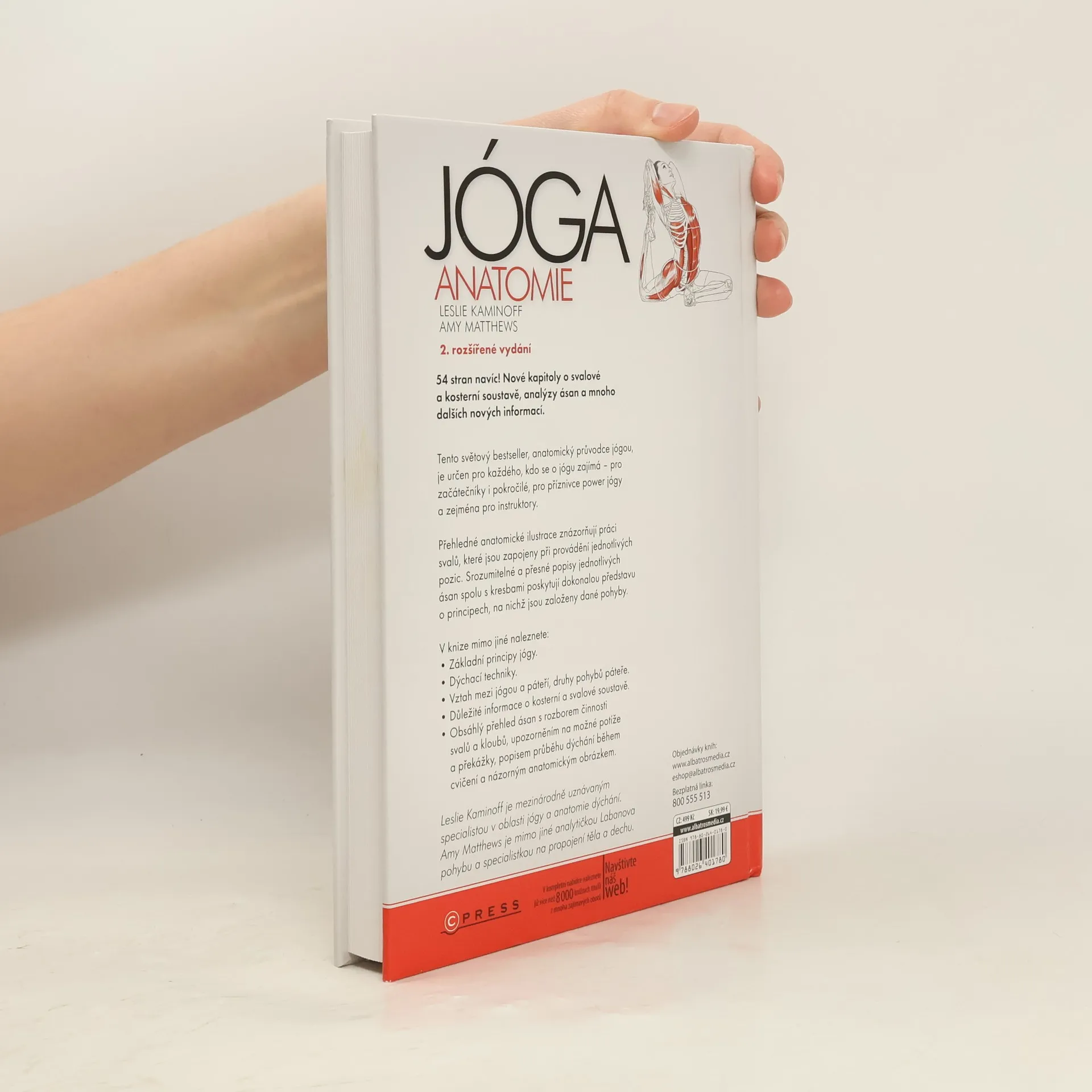 Názorná ilustrovaná publikace určená jak zájemcům o cvičení jógy, tak instruktorům a lektorům. Laické veřejnosti přiblíží význam jógy a její blahodárné působení na svalové skupiny, instruktorům pomůže v jejich práci: kniha představuje jednotlivé pozice - asány - a jejich vliv na svaly, zapojené při provádění daných cviků, s přesnými popisy svalů přímo v ilustraci a srozumitelným slovním vysvětlením. Tento světový bestseller, anatomický průvodce jógou, je určen pro každého, kdo se o jógu zajímá pro začátečníky i pokročilé, pro příznivce power jógy a zejména pro instruktory. Přehledné anatomické ilustrace znázorňují práci svalů, které jsou zapojeny při provádění jednotlivých pozic. Srozumitelné a přesné popisy jednotlivých ásan spolu s kresbami poskytují dokonalou představu o principech, na nichž jsou založeny dané pohyby. V knize mimo jiné naleznete: Základní principy jógy. Dýchací techniky. Vztah mezi jógou a páteří, druhy pohybů páteře. Obsáhlý přehled ásan s rozborem činnosti svalů a kloubů, upozorněním na možné potíže a překážky, popisem průběhu dýchání během cvičení a názorným anatomickým obrázkem. Autor Leslie Kaminoff je mezinárodně uznávaným specialistou v oblasti jógy a anatomie dýchání. Bydlí v USA a pracuje v New Yorku.