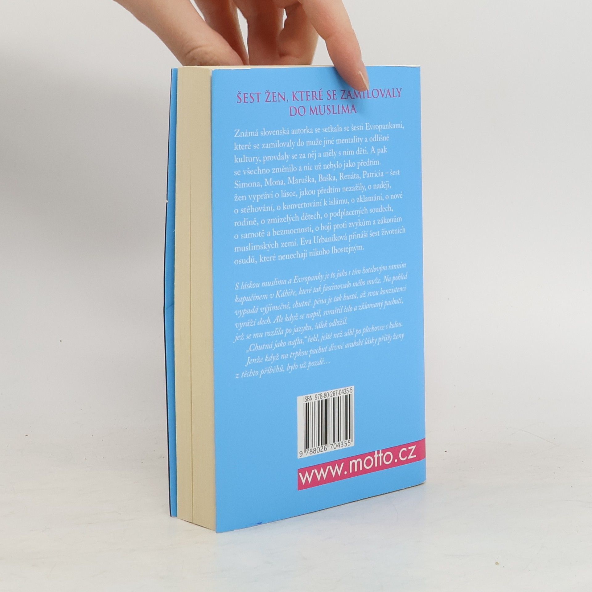 Skutečné příběhy žen, které milovaly muslima Eva Urbaníková ve své nové knize přináší šest životních osudů, které nenechají nikoho lhostejným. Simona, Mona, Maruška, Baška, Renáta, Patrícia – šest žen vypráví o lásce, jakou předtím nezažily, o naději, o stěhování, o konvertování k islámu, o zklamání, o nové rodině, o zmizelých dětech, o podplacených soudech, o samotě a bezmocnosti, o boji proti zvykům a zákonům muslimských zemí.