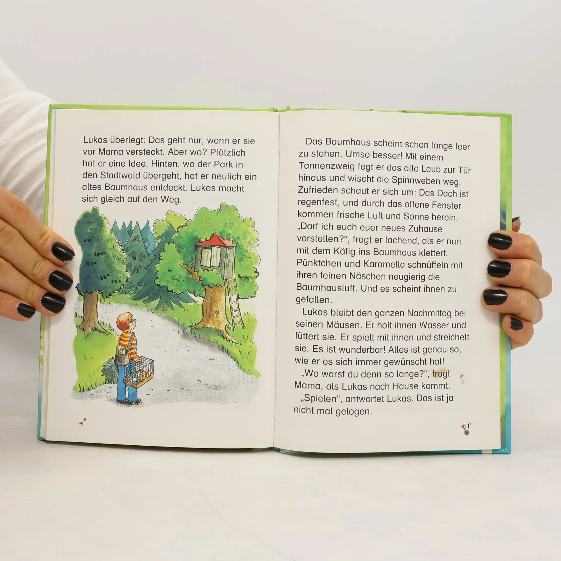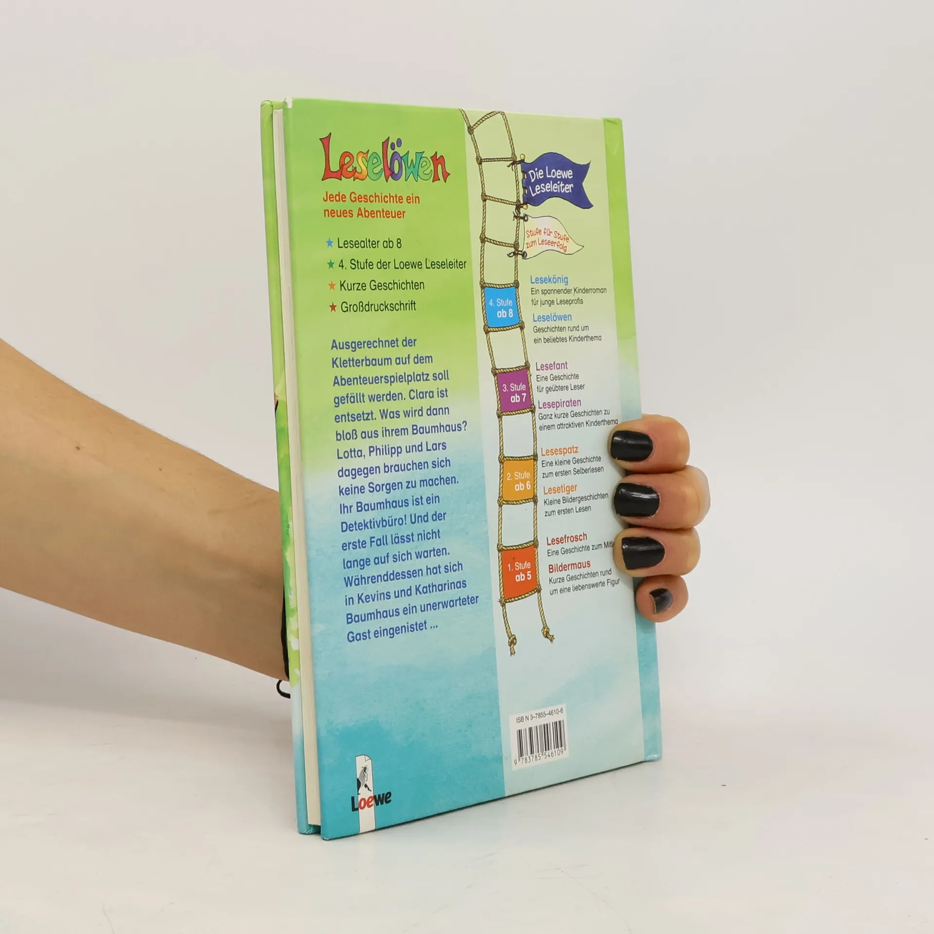 Lesealter ab 8 4. Stufe der Loewe-Leseleiter Kurze Geschichten Großdruckschrift Ausgerechnet der Kletterbaum auf dem Abenteuerspielplatz soll gefällt werden. Clara ist entsetzt. Was soll dann bloß aus ihrem Baumhaus werden? Lotta, Philipp und Lars dagegen brauchen sich keine Sorgen zu machen. Ihr Baumhaus ist ein Detektivbüro! Und der erste Fall lässt nicht lange auf sich warten. Währenddessen hat sich in Kevins und Katharinas Baumhaus ein unerwarteter Gast eingenistet.