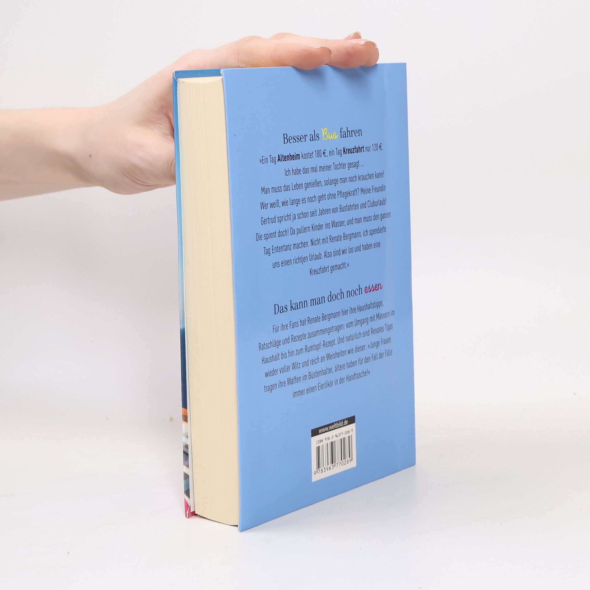 Ein Tag Altenheim kostet 180 €, ein Tag Kreuzfahrt nur 120 €. Ich habe das mal meiner Tochter gesagt.«Man muss das Leben genießen, solange man noch krauchen kann! Wer weiß, wie lange es noch geht ohne Pflegekraft? Meine Freundin Gertrud spricht ja schon seit Jahren von Busfahrten und Kluburlaub! Die spinnt doch! Da pullern Kinder ins Wasser und man muss den ganzen Tag Ententanz machen. Nicht mit Renate Bergmann, ich spendierte uns einen richtjen Urlaub.Also sind wir los und haben eine Kreuzfahrt gemacht. Die fahren gar nicht über Kreuz, sondern eine große Schleife. Wussten Sie das?Wir haben jedenfalls viel erlebt. Ich habe den ganzen Schrank voll mit neuen flauschigen Handtüchern, und im Froster ist Dauerwurst vom Büfett für bis Ostern hin!»