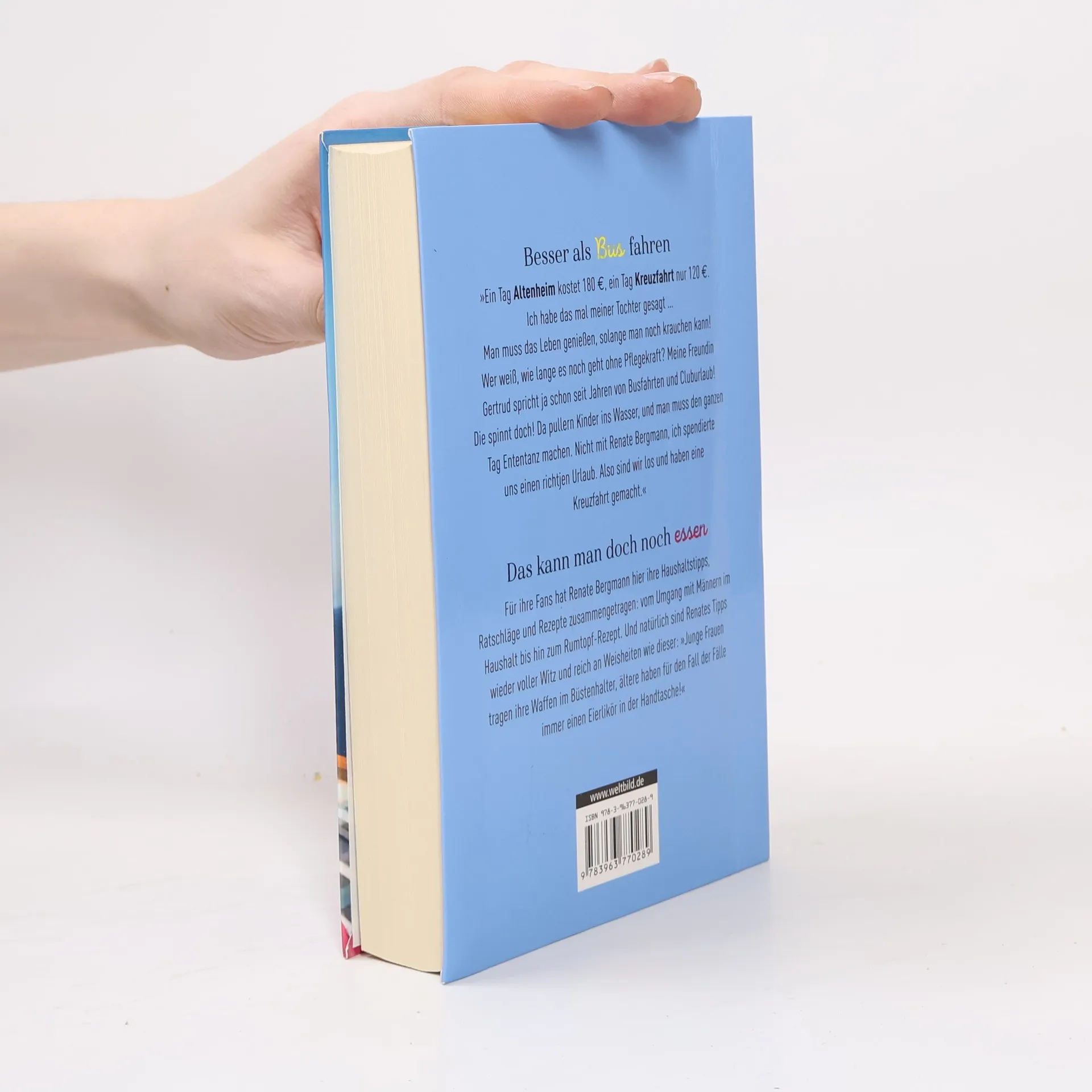 Ein Tag Altenheim kostet 180 €, ein Tag Kreuzfahrt nur 120 €. Ich habe das mal meiner Tochter gesagt.«Man muss das Leben genießen, solange man noch krauchen kann! Wer weiß, wie lange es noch geht ohne Pflegekraft? Meine Freundin Gertrud spricht ja schon seit Jahren von Busfahrten und Kluburlaub! Die spinnt doch! Da pullern Kinder ins Wasser und man muss den ganzen Tag Ententanz machen. Nicht mit Renate Bergmann, ich spendierte uns einen richtjen Urlaub.Also sind wir los und haben eine Kreuzfahrt gemacht. Die fahren gar nicht über Kreuz, sondern eine große Schleife. Wussten Sie das?Wir haben jedenfalls viel erlebt. Ich habe den ganzen Schrank voll mit neuen flauschigen Handtüchern, und im Froster ist Dauerwurst vom Büfett für bis Ostern hin!»