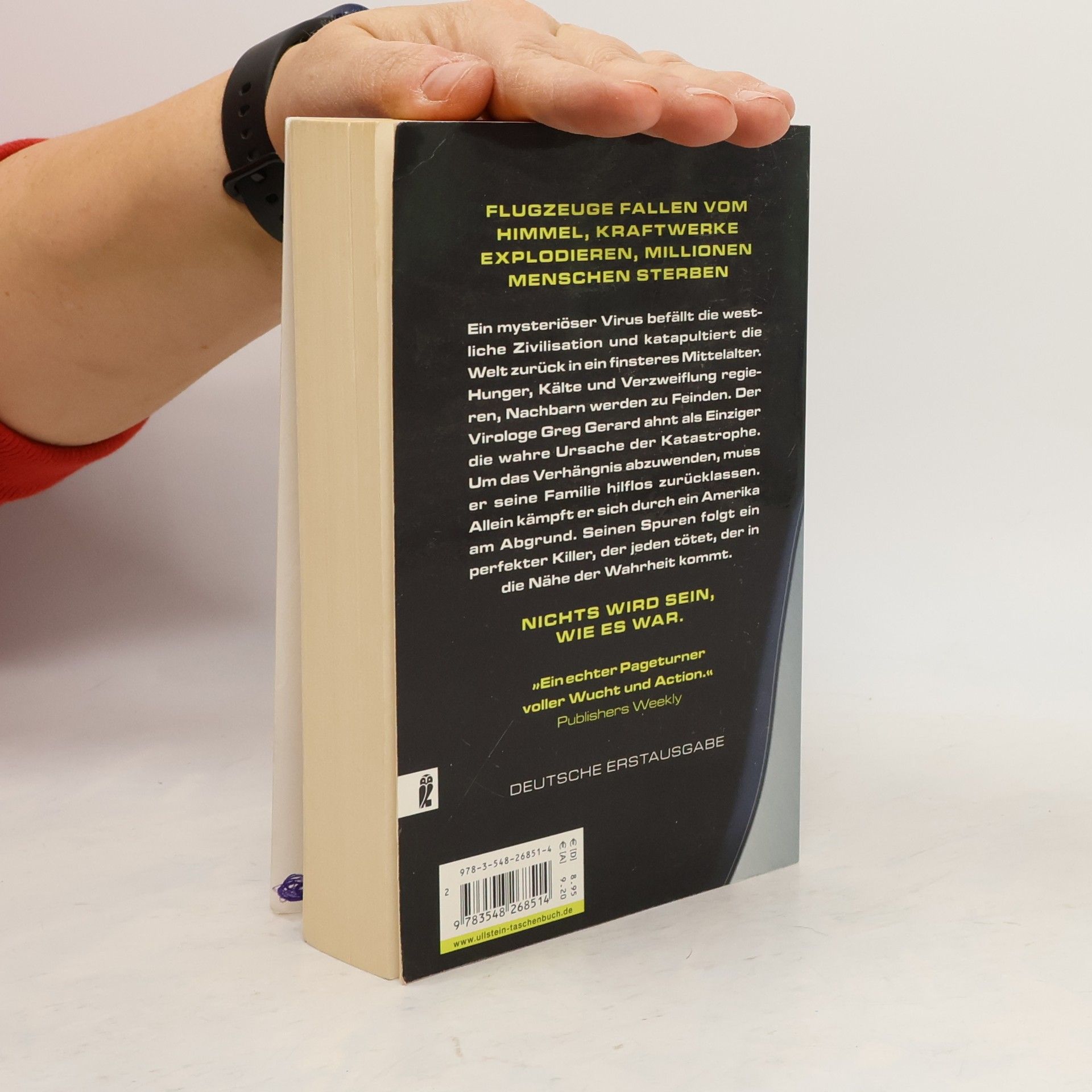 Flugzeuge fallen vom Himmel, Kraftwerke explodieren, Millionen Menschen sterben Ein mysteriöser Virus befällt die westliche Zivilisation und katapultiert die Welt zurück in ein finsteres Mittelalter. Hunger, Kälte und Verzweiflung regieren, Nachbarn werden zu Feinden. Der Virologe Greg Gerard ahnt als Einziger die wahre Ursache der Katastrophe. Um das Verhängnis abzuwenden, muss er seine Familie hilflos zurücklassen. Allein kämpft er sich durch ein Amerika am Abgrund. Seinen Spuren folgt ein perfekter Killer, der jeden tötet, der in die Nähe der Wahrheit kommt. Nichts wird sein, wie es war.