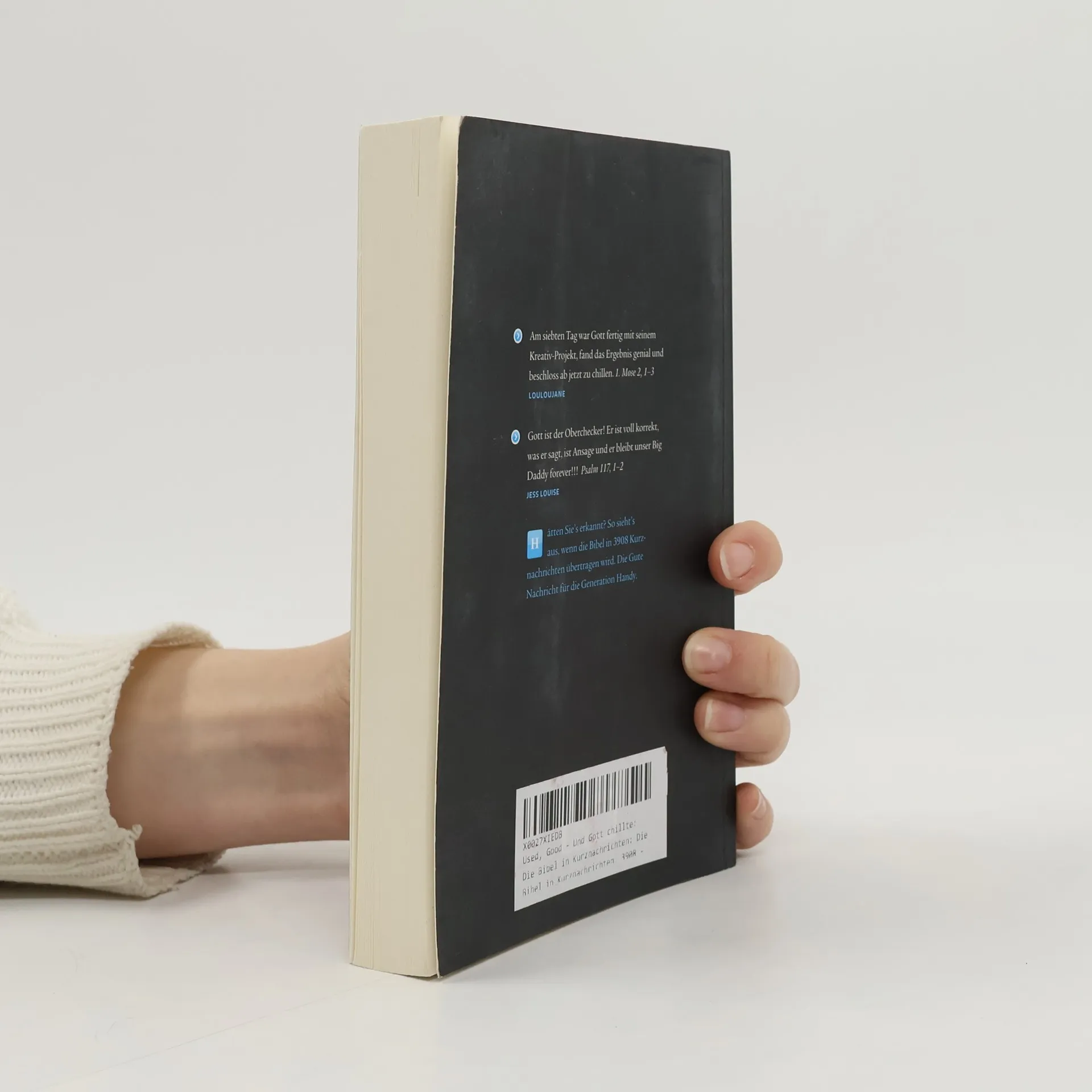 Am siebten Tag war Gott fertig mit seinem Kreativ-Projekt, fand das Ergebnis genial und beschloss ab jetzt zu chillen. 1. Mose 2, 1–3 (louloujane,) Gott ist der Oberchecker! Er ist voll korrekt, was er sagt, ist Ansage und er bleibt unser Big Daddy forever!!! Psalm 117, 1–2 (jess louise) Hätten Sie´s erkannt? So sieht´s aus, wenn die Bibel in 3908 Kurznachrichten übertragen wird. Die Gute Nachricht für die Generation Handy. 500 Jahre nach Luther: Über 3000 Menschen – Alte und Junge, Protestanten, Katholiken und Zweifler – scharen sich aufgeregt um die Bibel. Sie haben eine gemeinsame Mission. Es gilt, Altes und Neues Testament in die heute geläufige Sprache zu übertragen, Twitter- oder auch SMSDeutsch genannt. Das heißt: 3908 Bibelstellen in Kurznachrichten zu je 140 Zeichen zusammenzufassen. Dauern solide Bibelübertragungen in der Regel mehrere Jahrzehnte, so hat man hier noch nicht mal eine Woche Zeit. Der Rekordversuch startet vier Tage vor Pfingsten, am Pfingstsonntag liegen 6000 Zusammenfassungen vor. Dieses Projekt markiert den Auftakt des neuen Internetportals evangelisch. de. Der Bibel-Twitter-Rekord wurde 2009 auf dem Evangelischen Kirchentag in Bremen erreicht. Für das Begleitbuch „Und Gott chillte“ sind die markantesten 3908 Bibelstellen für eine verblüffende Bibelübertragung ausgewählt. Sie eignet sich hervorragend für den Konfirmandenunterricht oder als Inspiration neben der Lutherbibel 1984.