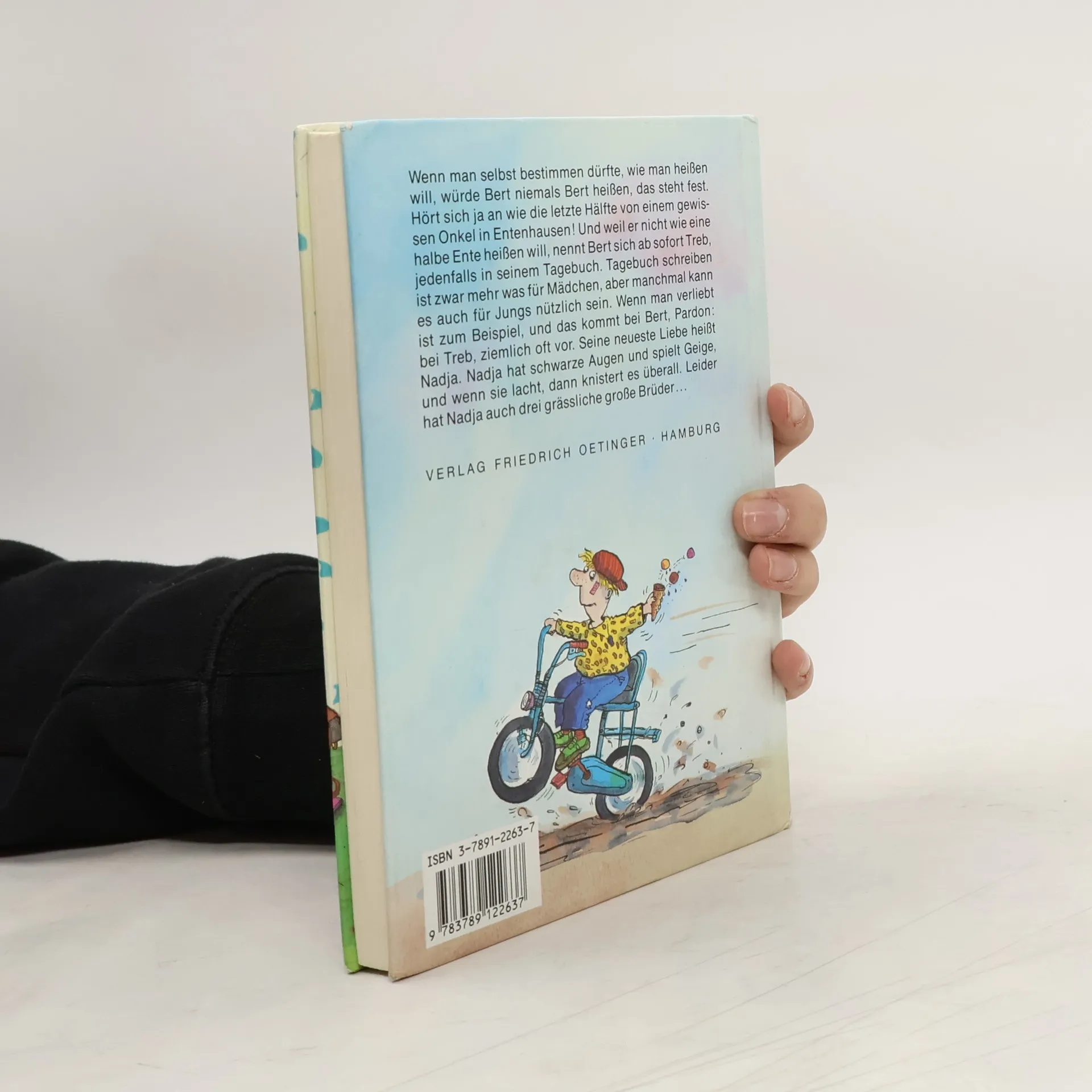 Wenn man selbst bestimmen dürfte, wie man heißen will, würde Bert niemals Bert heißen, das steht fest. Hört sich ja an wie die letzte Hälfte von einem gewissen Onkel in Entenhausen! Und weil er nicht wie eine halbe Ente heißen will, nennt Bert sich ab sofort Treb, jedenfalls in seinem Tagebuch. Tagebuch schreiben ist zwar mehr was für Mädchen, aber manchmal kann es auch für Jungs nützlich sein. Wenn man verliebt ist zum Beispiel, und das kommt bei Bert, Pardon: bei Treb, ziemlich oft vor. Seine neueste Liebe heißt Nadja. Nadja hat schwarze Augen und spielt Geige, und wenn sie lacht, dann knistert es überall. Leider hat Nadja auch drei grässliche große Brüder...