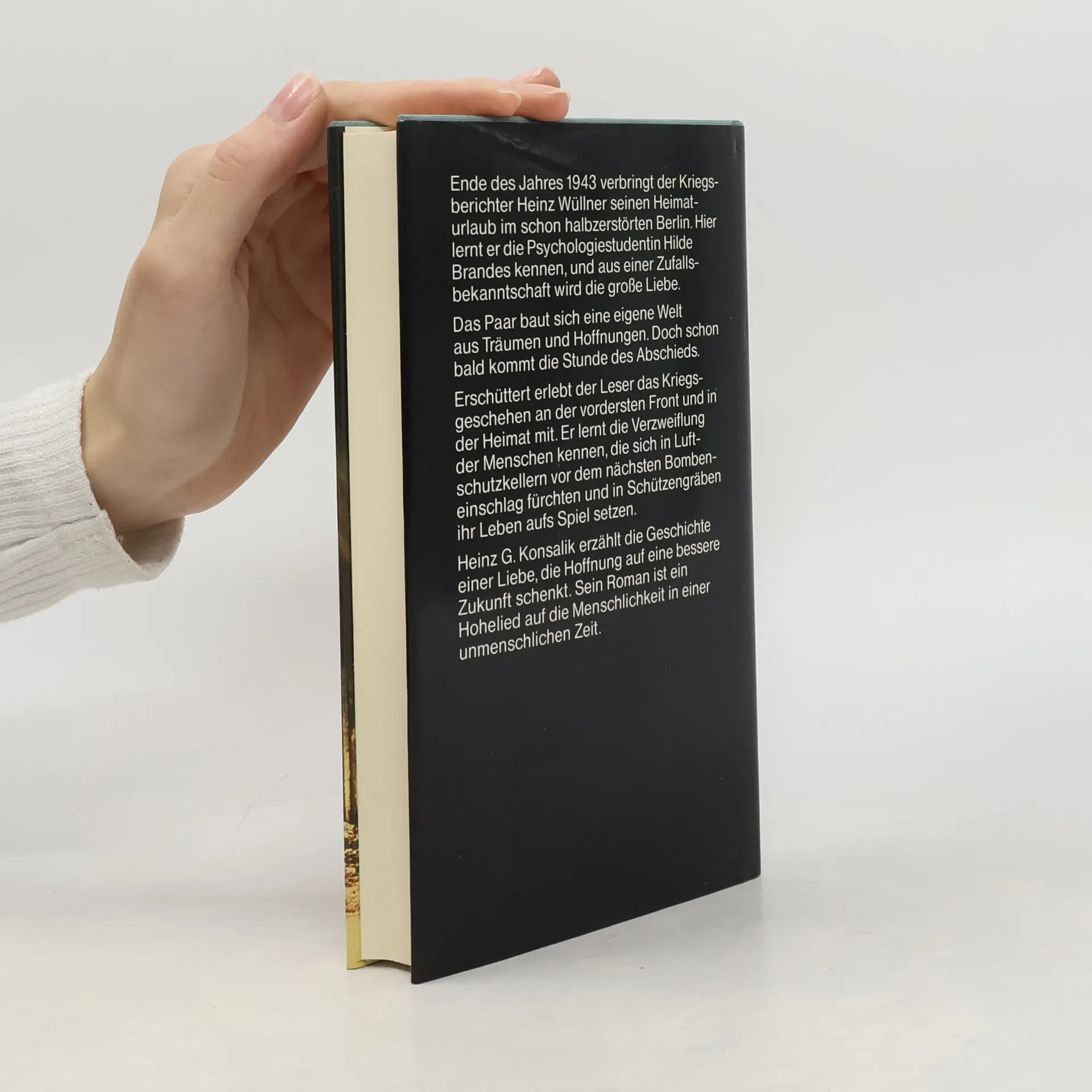 Ende des Jahres 1943 verbringt der Kriegsberichter Heinz Wullner seinen Heimturlaub im schon halbzerstorten Berlin. hier lernt er die Psychologiestudentin Hilde Brandes kennen, und aus einer Zufallsbekanntschaft wird die grosse Liebe. Das Paar baut sich eine eigene Welt aus Traumen und Hoffnungen. Doch schon bald kommt die Stunde des Abschieds. Erschuttert erlebt der vordersten Front und in der Heimat mit. Er lernt die Verzweiflung der Menschen kennen, die sich in Luftschutzkellern vor dem nachsten Bombeneinschlag furchten und in Schulzengraben ihr Leben aufs Spiel setzen. Heinz G. Konsalik erzahlt die Geschichte einer Liebe, die Hoffnung auf eine bessere Zukunft schenkt. Sein Roman ist ein Hohelied auf die Menschlichkeit in einer unmenschlichen Zeit.