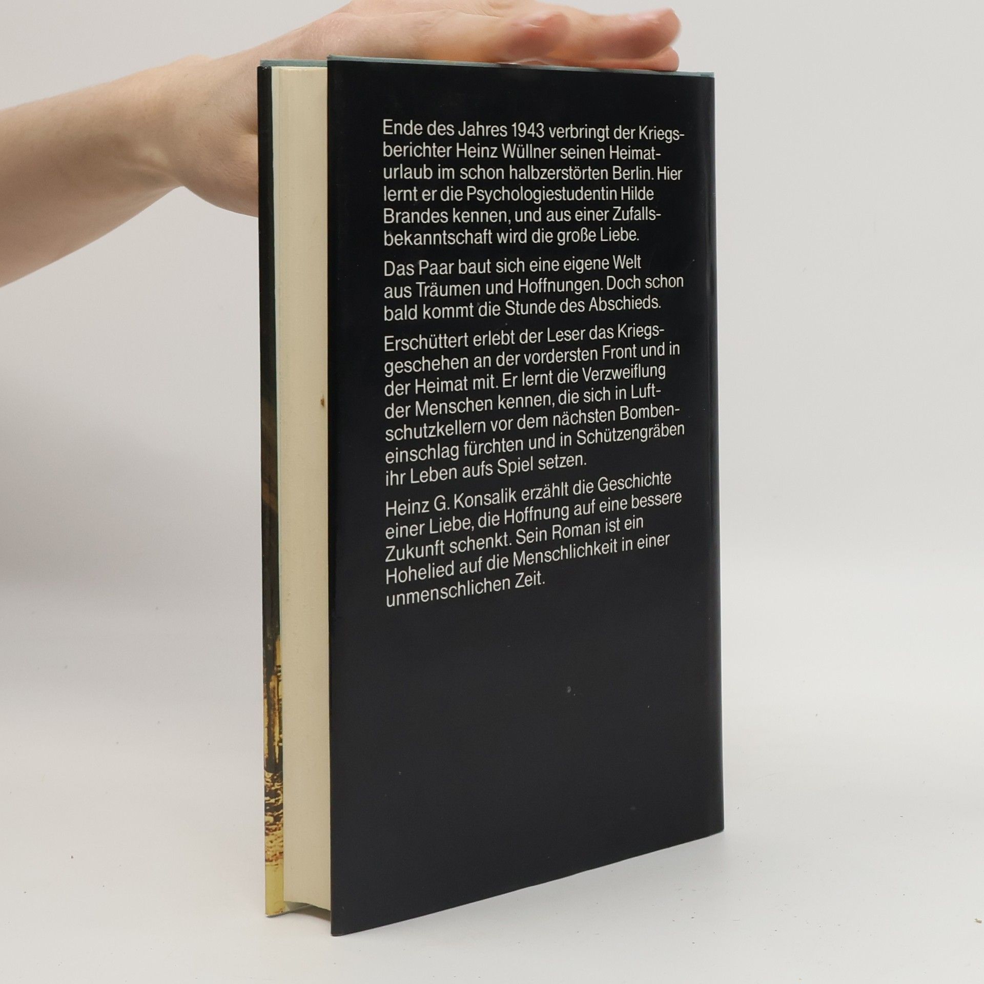 Ende des Jahres 1943 verbringt der Kriegsberichter Heinz Wullner seinen Heimturlaub im schon halbzerstorten Berlin. hier lernt er die Psychologiestudentin Hilde Brandes kennen, und aus einer Zufallsbekanntschaft wird die grosse Liebe. Das Paar baut sich eine eigene Welt aus Traumen und Hoffnungen. Doch schon bald kommt die Stunde des Abschieds. Erschuttert erlebt der vordersten Front und in der Heimat mit. Er lernt die Verzweiflung der Menschen kennen, die sich in Luftschutzkellern vor dem nachsten Bombeneinschlag furchten und in Schulzengraben ihr Leben aufs Spiel setzen. Heinz G. Konsalik erzahlt die Geschichte einer Liebe, die Hoffnung auf eine bessere Zukunft schenkt. Sein Roman ist ein Hohelied auf die Menschlichkeit in einer unmenschlichen Zeit.