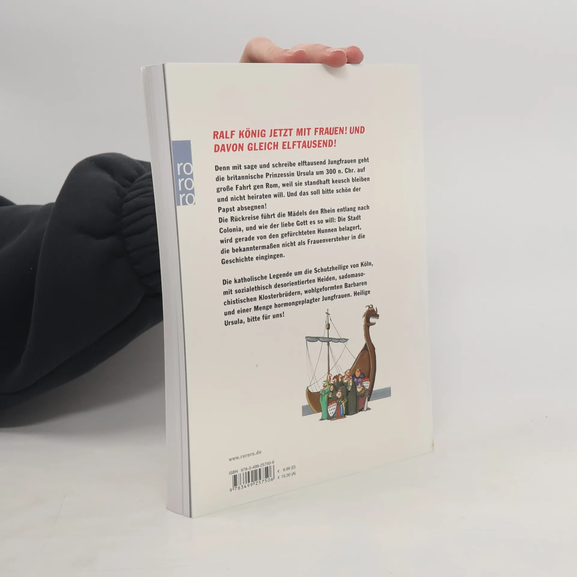 Ralf König jetzt mit Frauen! Und davon gleich elftausend! Denn mit sage und schreibe elftausend Jungfrauen geht die britannische Prinzessin Ursula um 300 n. Chr. auf große Fahrt gen Rom, weil sie standhaft keusch bleiben und nicht heiraten will. Und das soll bitte schön der Papst absegnen! Die Rückreise führt die Mädels den Rhein entlang nach Colonia, und wie der liebe Gott es so will: Die Stadt wird gerade von den gefürchteten Hunnen belagert, die bekanntermaßen nicht als Frauenversteher in die Geschichte eingingen. Die katholische Legende um die Schutzheilige von Köln, mit sozialethisch desorientierten Heiden, sadomasochistischen Klosterbrüdern, wohlgeformten Barbaren und einer Menge hormongeplagter Jungfrauen. Heilige Ursula, bitte für uns!