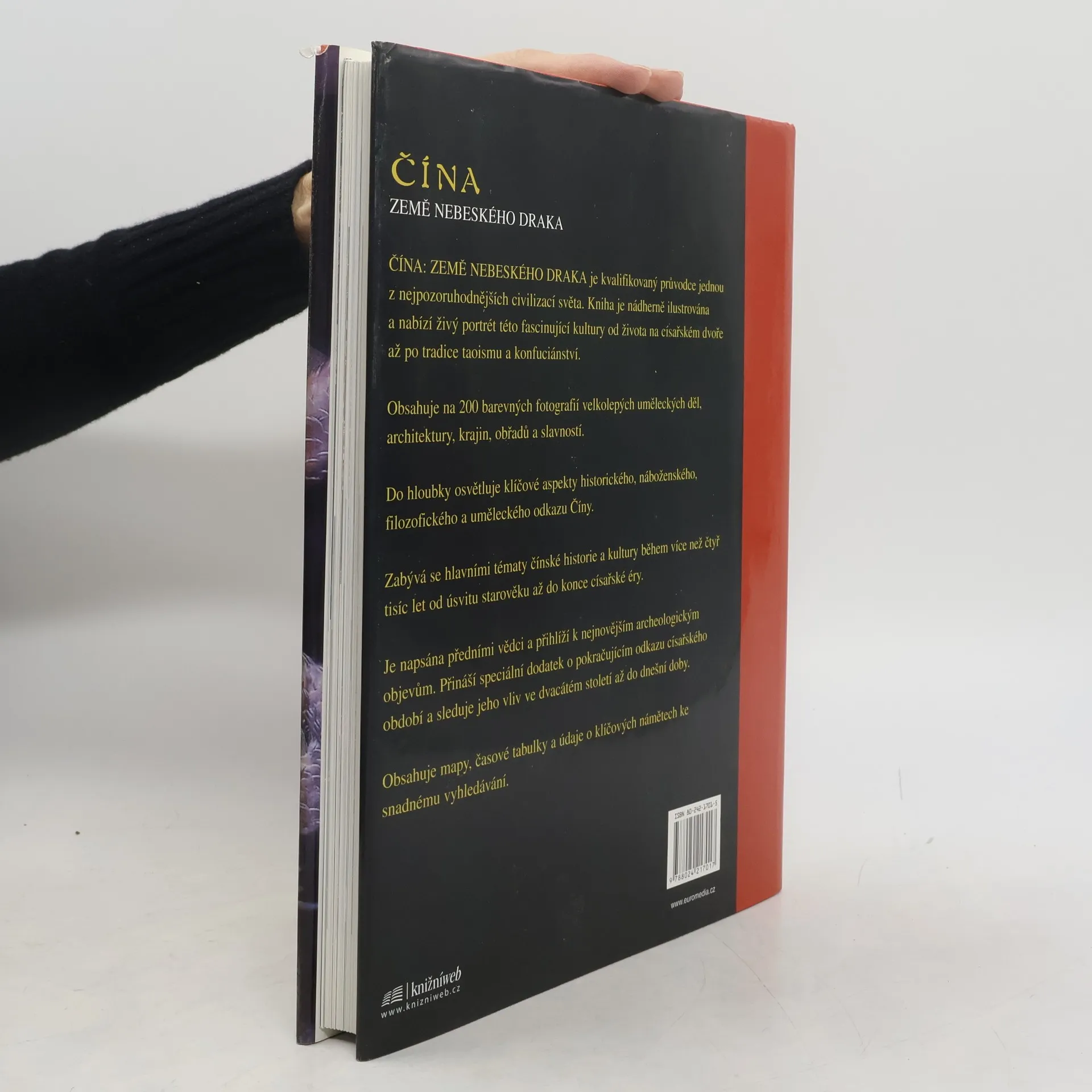 Pro západní oči je Čína jednou z nejtajemnějších a nejúžasnějších civilizací vůbec. Odkaz její dlouhé dynastické vlády, sahající až před rok 1500 př. n. l., zahrnuje fascinující pojetí filozofie, náboženství, umění, vědy a mytologie, které i nadále ovlivňují moderní svět. Publikace Čína: Země nebeského draka se zabývá idejemi této jedinečné kultury, čerpá z nejnovějších archeologických objevů a teorií a představuje dějiny, společnost a náboženství Číny od prehistorických legend až do konce císařské vlády v roce 1912. Zkoumá klíčové kulturní, duchovní a umělecké tradice této obrovské civilizace a líčí hlavní vědecké a technické čínské vynálezy jako střelný prach, tisk a kompas. Vyvrací konvenční názor, že Čína je izolovanou civilizací a zdůrazňuje mezinárodní a kosmopolitní charakter jejích dějin. Závěrečná část se zabývá pokračujícím odkazem císařského období v bouřlivých letech dvacátého století až do dnešních dnů. Množství barevných fotografií a reprodukcí uměleckých děl v kombinaci se čtivým a erudovaným textem zobrazuje zvyky a tradice čínského světa od života v nejodlehlejších vesnicích až po dění na císařském dvoře. 2. vydání.