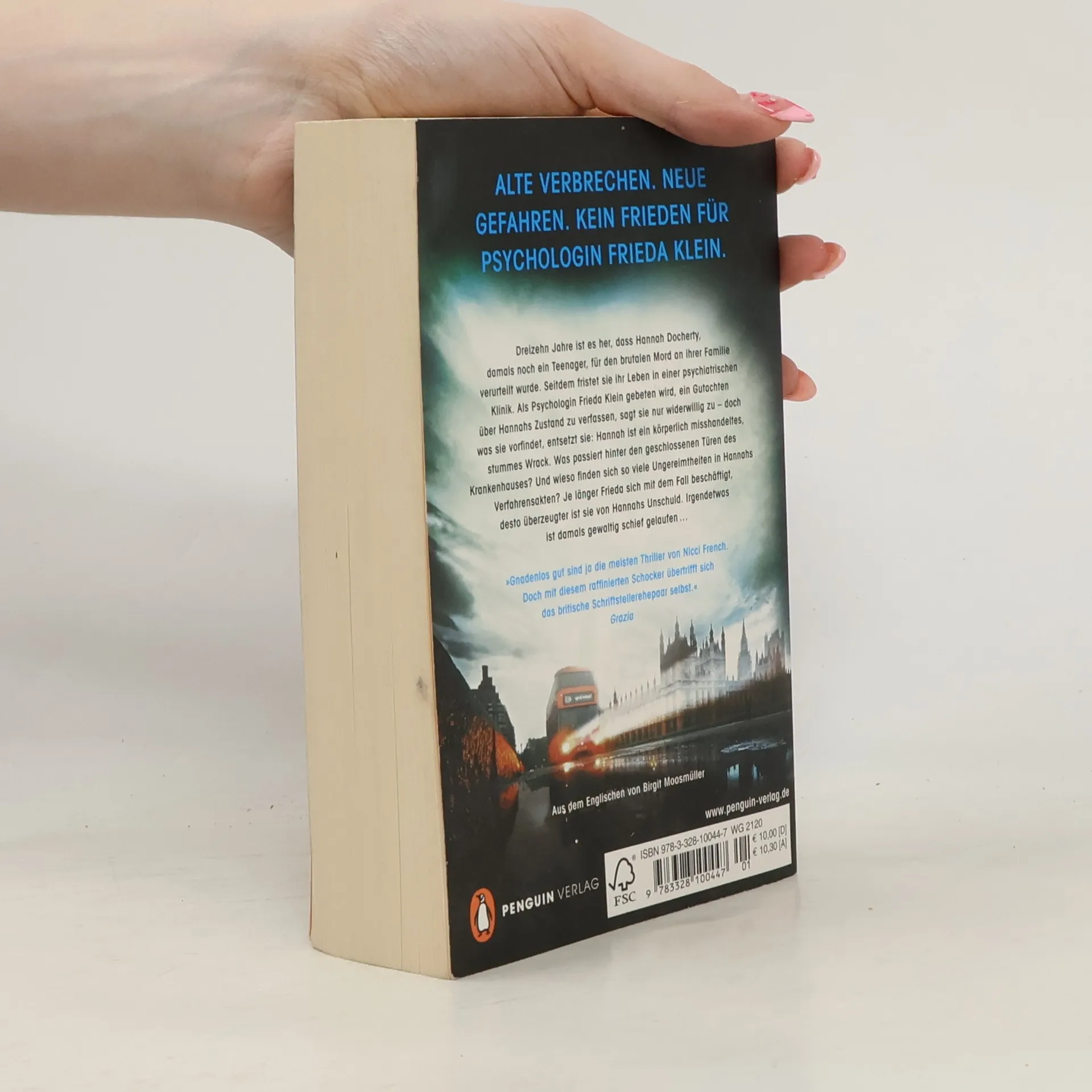 Frieda Klein kann nach den Aufregungen der Vergangenheit endlich aufatmen, glaubt sie, und sich Patienten, Freunden und Hobbys zuwenden. Doch schon bald holt eine offene Schuld sie ein – und wider Willen wird sie in den Fall Hannah Docherty verwickelt. Die über Dreißigjährige soll im Mai 2001 ihre Familie ermordet haben. Seitdem fristet sie ihr Leben, Medikamenten und Misshandlungen ausgesetzt, in einer psychiatrischen Klinik. Schon bald ist Frieda von Hannahs Unschuld überzeugt und setzt alles daran, den Fall neu aufzurollen ... Doch sie hat noch andere Sorgen – Dean Reeve, ihr Feind und Beschützer, ist anscheinend wieder aufgetaucht. Ein packender Thriller um die langen Schatten der Vergangenheit.