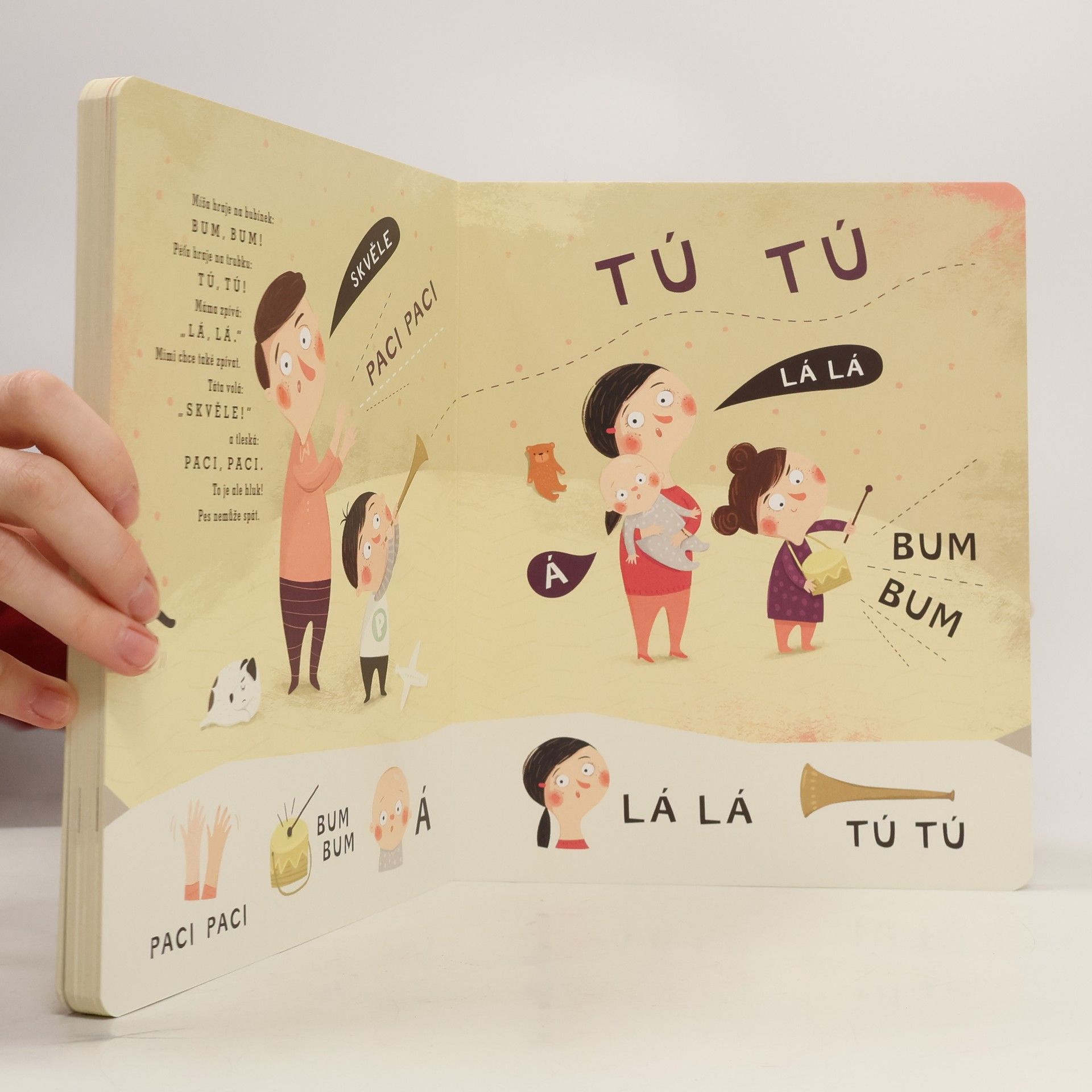Seznamte se s Péťou a jeho veselou rodinkou! Krásně ilustrované leporelo se stane oblíbeným průvodcem při prvních krůčcích v mluvení. Soustředí se především na zvukomalebné výrazy a samohlásky, které používají už roční děti. Kniha má záměrně jednoduchou formu a je doplněna krásnými ilustracemi, které dítě motivují, aby pojmenovávalo objekty a opakovalo zvuky, což přirozeně vývoj jeho řeči podporuje. Leporelo je určeno dětem od 12 měsíců.