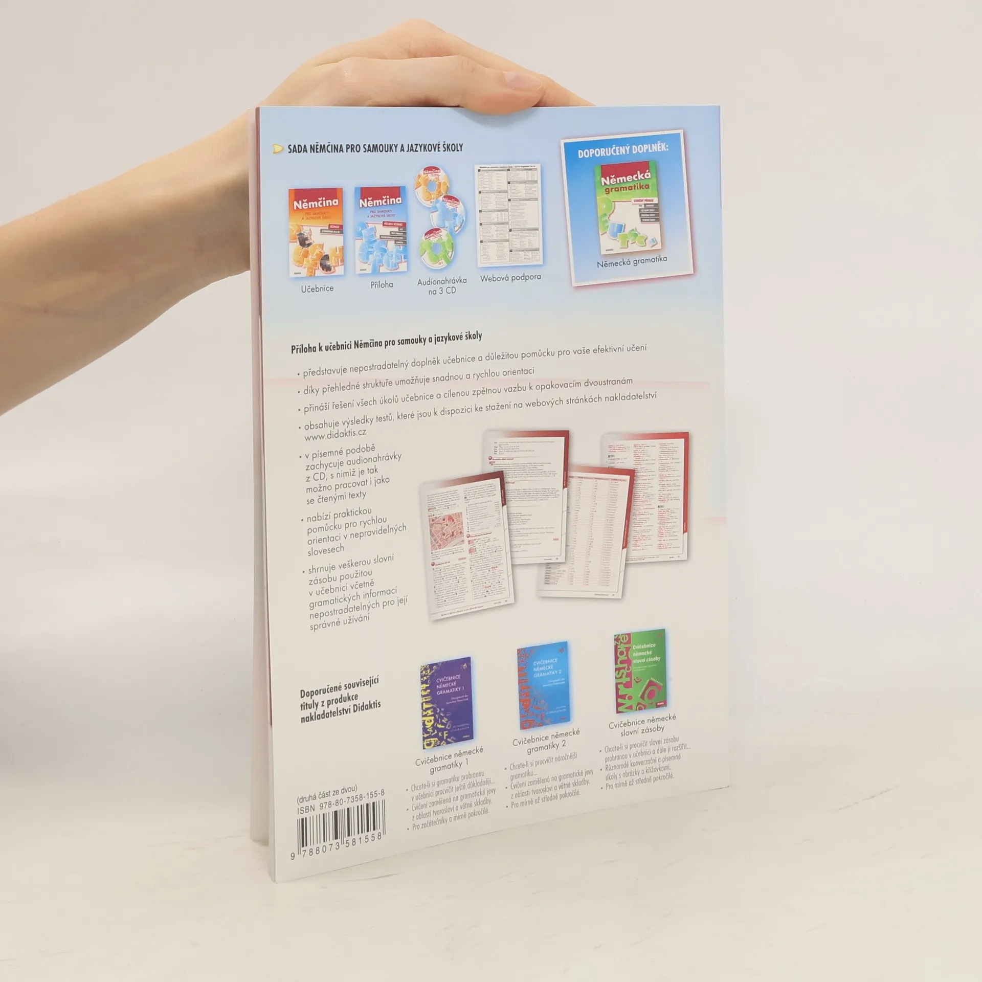 Sada složená z učebnice, přílohy a tří CD. Přehledná a graficky poutavá učebnice vhodná pro zájemce o němčinu s nulovými či minimálními výchozími znalostmi i pro věčné začátečníky obsahuje texty a slovní zásobu z řady praktických oblastí (práce, bydlení, cestování, kultura, nemoc), cvičení zaměřená na gramatiku a využitelná v praxi..