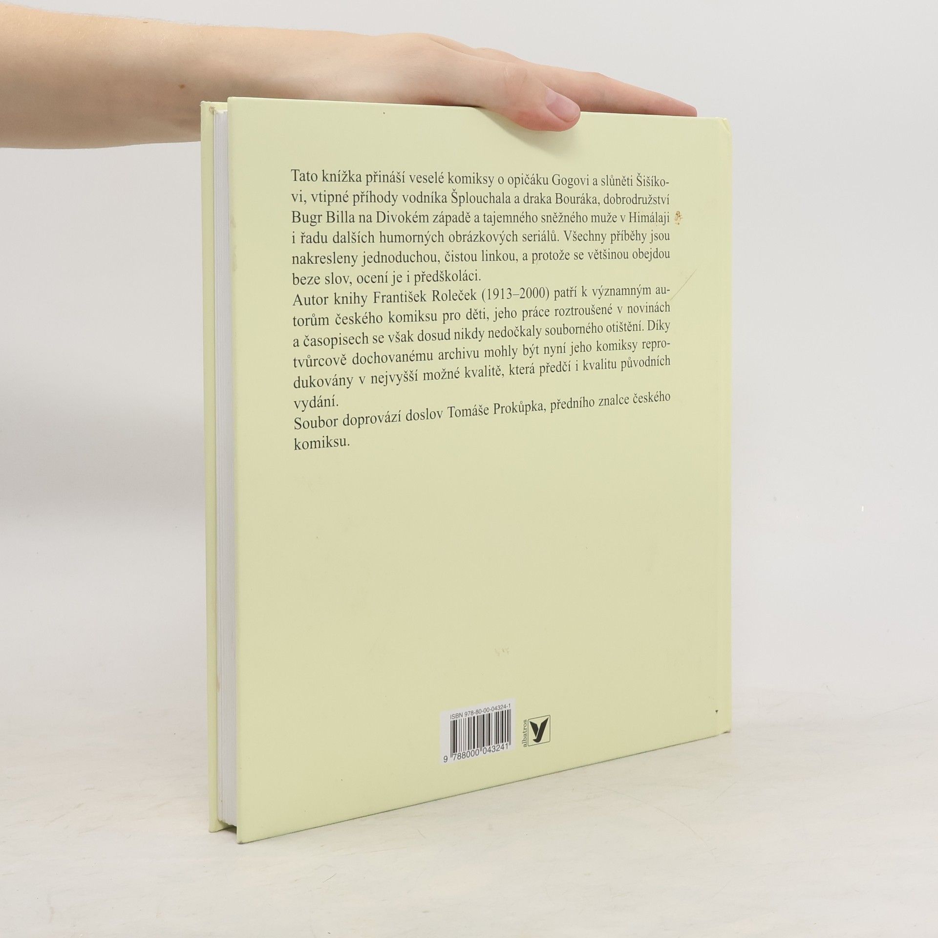 Kniha přináší veselé komiksy o opičáku Gogovi a slůněti Šišíkovi, vtipné příhody vodníka Šplouchala a draka Bouráka, dobrodružství Bugr Billa na Divokém západě a tajemného sněžného muže v Himalájích i řadu dalších humorných obrázkových seriálů. Všechny příběhy jsou nakresleny jednoduchou, čistou linkou, a protože se většinou obejdou beze slov, ocení je i předškoláci. Autor knihy František Roleček (1913–2000) patří k významným autorům českého komiksu pro děti, jeho práce roztroušené v novinách a časopisech se však dosud nikdy nedočkaly souborného otištění. Díky tvůrcově dochovanému archivu mohly být nyní jeho komiksy reprodukovány v nejvyšší možné kvalitě, která předčí i kvalitu původních vydání. Soubor doprovází doslov Tomáše Prokůpka, předního znalce domácího komiksu.