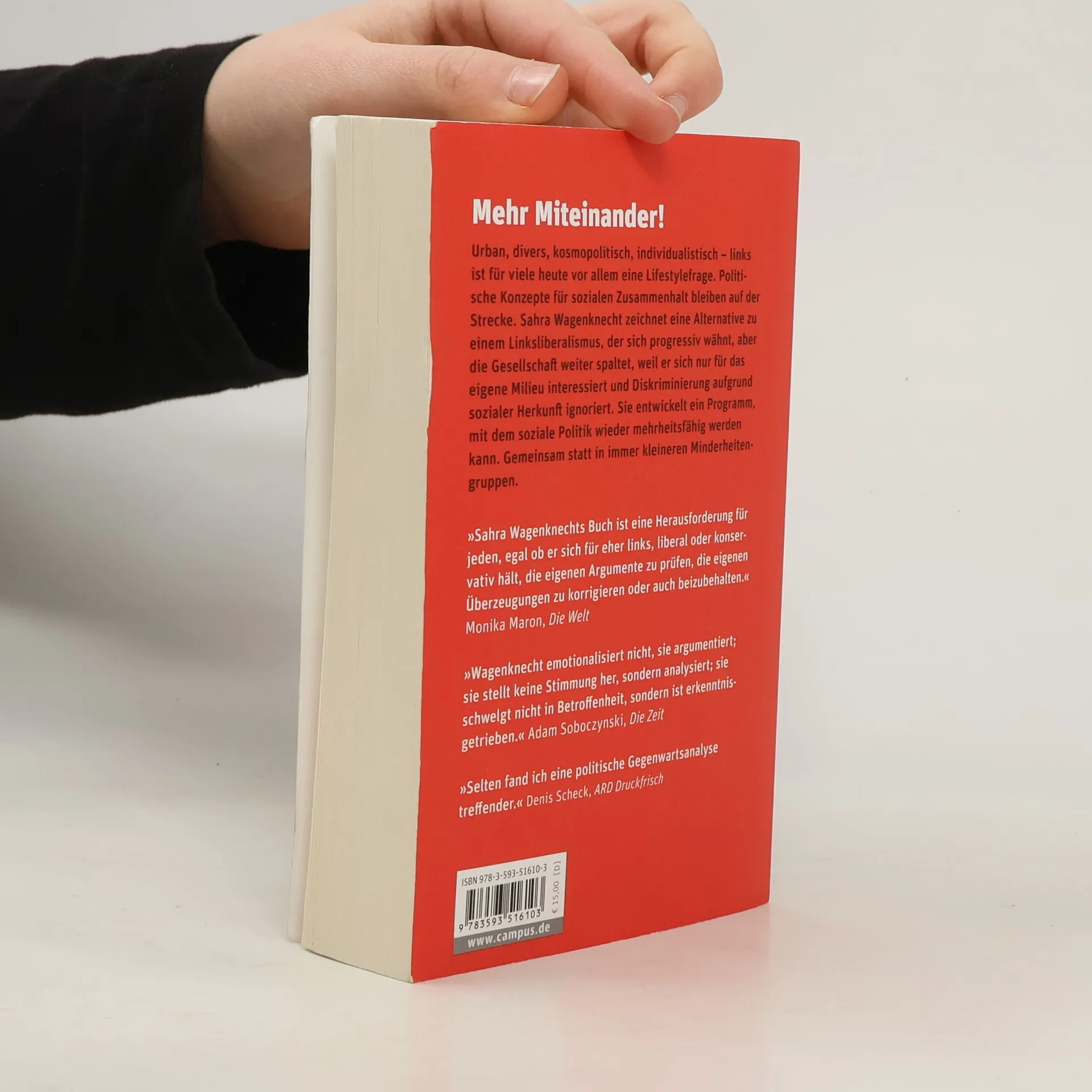 Urban, divers, kosmopolitisch, individualistisch – links ist für viele heute vor allem eine Lifestylefrage. Politische Konzepte für sozialen Zusammenhalt bleiben auf der Strecke. Sahra Wagenknecht zeichnet eine Alternative zu einem Linksliberalismus, der sich progressiv wähnt, aber die Gesellschaft weiter spaltet, weil er sich nur für das eigene Milieu interessiert und Diskriminierung aufgrund sozialer Herkunft ignoriert. Sie entwickelt ein Programm, mit dem soziale Politik wieder mehrheitsfähig werden kann. Gemeinsam statt in immer kleineren Minderheitengruppen. »Sahra Wagenknechts Buch ist eine Herausforderung für jeden, egal ob er sich für eher links, liberal oder konservativ hält, die eigenen Argumente zu prüfen, die eigenen Überzeugungen zu korrigieren oder auch beizubehalten.« Monika Maron, Die Welt »Wagenknecht emotionalisiert nicht, sie argumentiert; sie stellt keine Stimmung her, sondern analysiert; sie schwelgt nicht in Betroffenheit, sondern ist erkenntnisgetrieben.« Adam Soboczynski, Die Zeit »Selten fand ich eine politische Gegenwartsanalyse treffender.« Denis Scheck, ARD Druckfrisch
