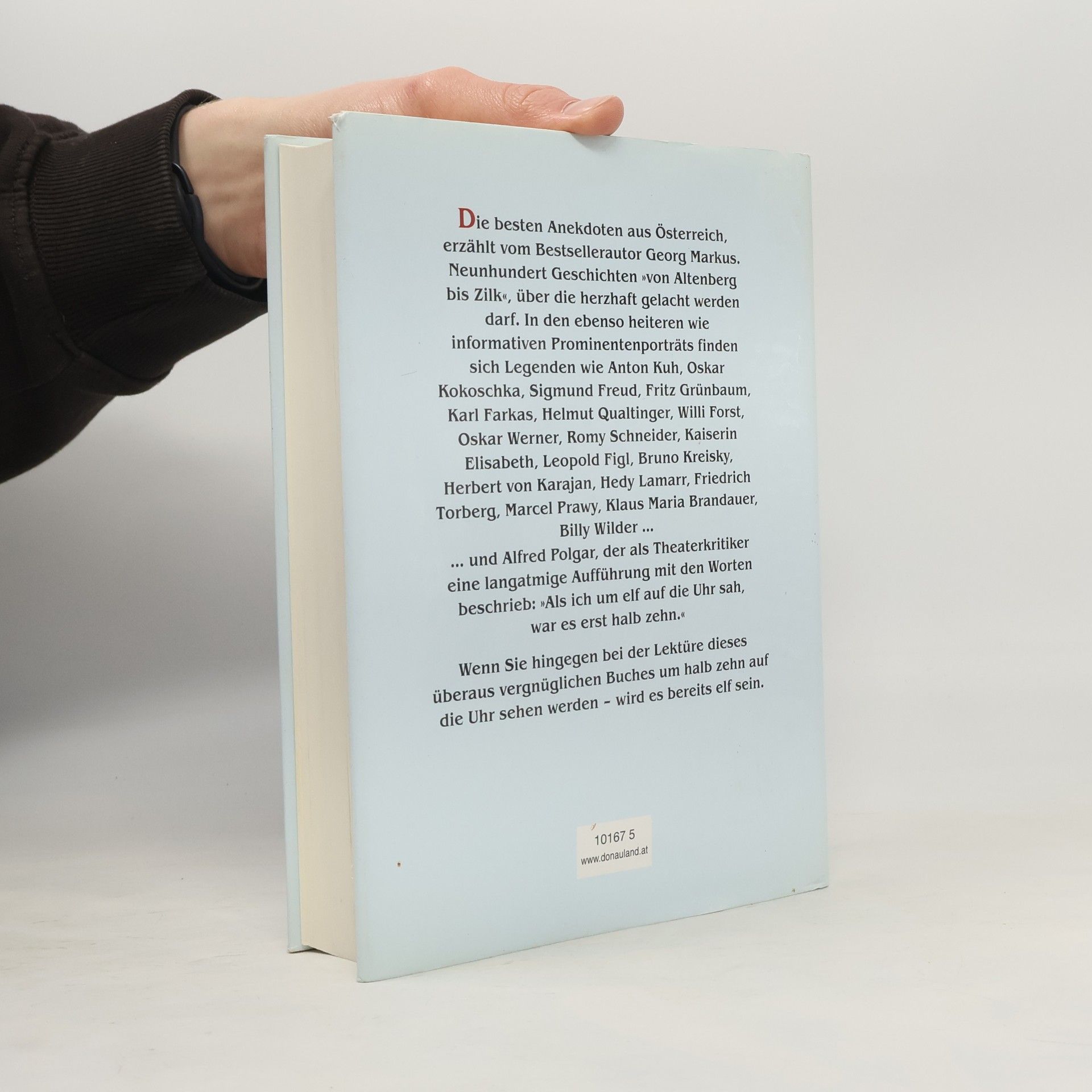Lachen von A–Z: Ein Hausbuch für jeden Österreicher. Der Bestseller jetzt im Taschenbuch! Von A bis Z darf geschmunzelt und gelacht werden! Rund neunhundert Anekdoten hat Georg Markus in dieser einzigartigen Enzyklopädie österreichischen Humors versammelt. Persönlichkeiten aus Kunst, Kultur, Politik, Wissenschaft und Sport geben sich darin die Ehre: Peter Alexander, Kaiser Franz Joseph, Sisi, Herbert v. Karajan, Karl Kraus, Gustav Mahler, Hans Moser, Helmut Qualtinger, Otto Schenk, Arthur Schnitzler oder Paula Wessely … und auch Alfred Polgar, der als Theaterkritiker eine langatmige Aufführung mit den Worten beschrieb: »Als ich um elf auf die Uhr sah, war es erst halb zehn.« Wenn Sie hingegen bei der Lektüre dieses überaus vergnüglichen Buchs um halb zehn auf die Uhr sehen werden – wird es bereits elf sein.