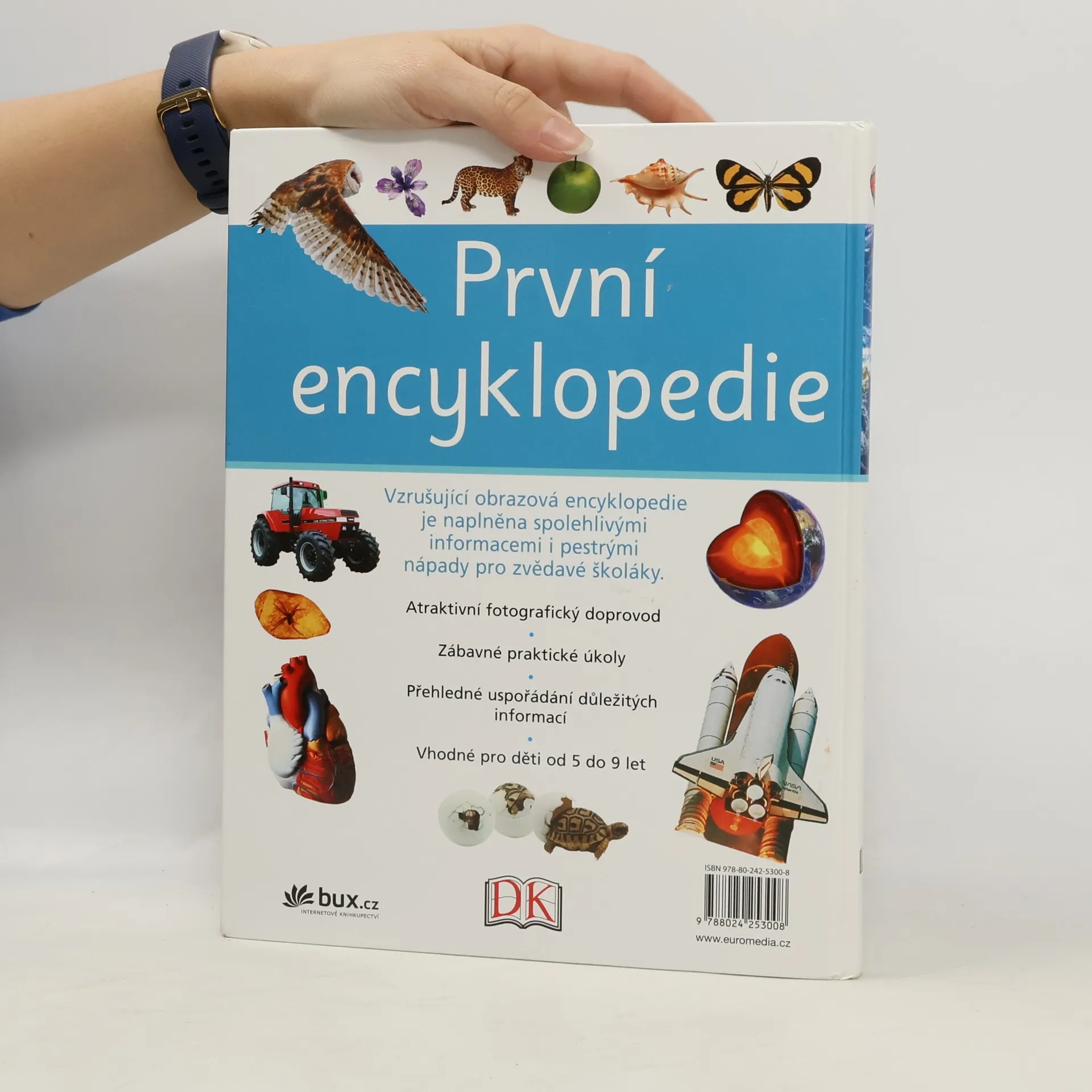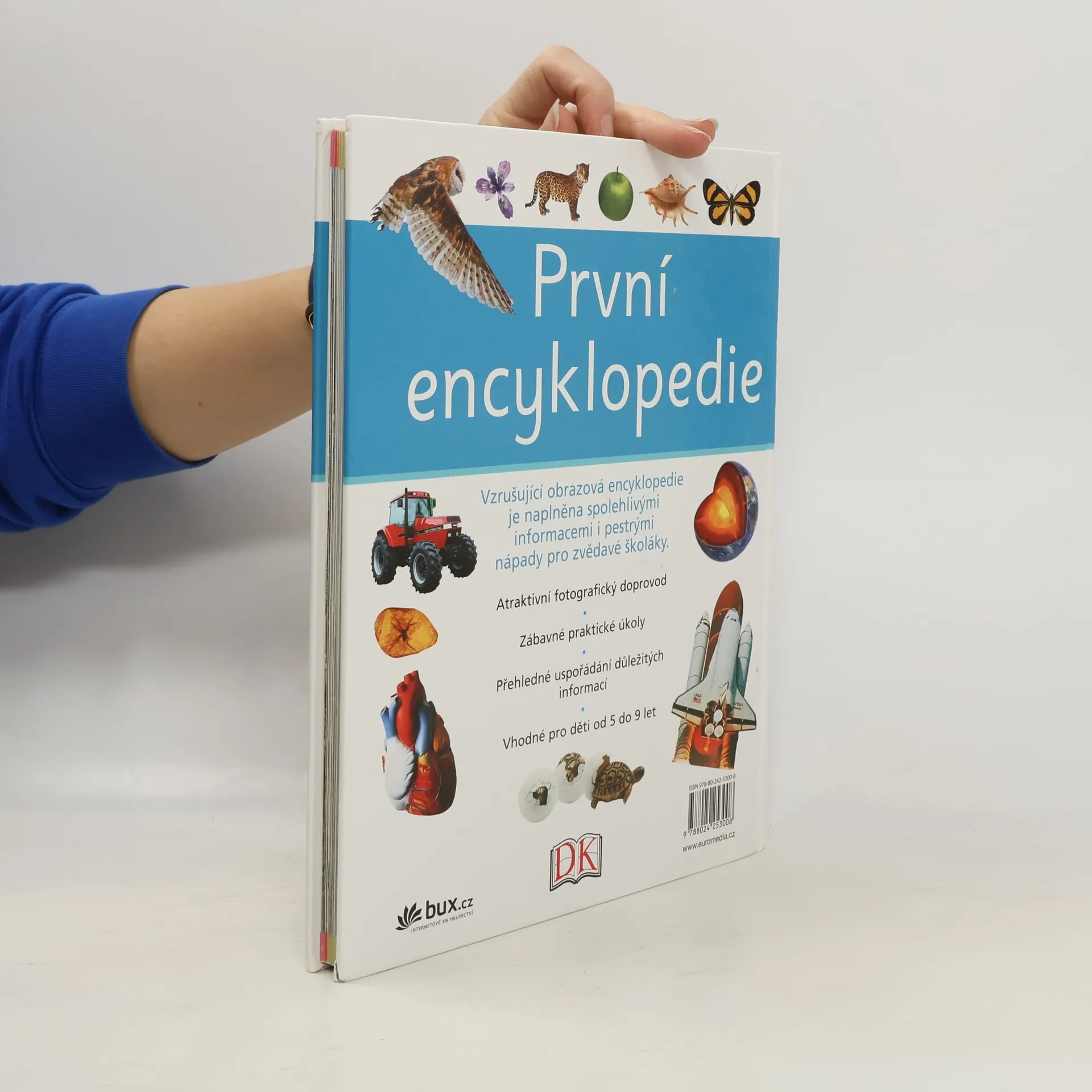První encyklopedie seznamuje malé čtenáře s mnoha zajímavými fakty ze všech oblastí. Předkládá informace moderním způsobem, díky němuž dítě snadno najde, co potřebuje. Každá dvojstránka je zábavná, pestrá a přehledná. Výborné fotografie rozvíjejí znalosti ze všech oborů od zeměpisu a přírodopisu k dávné historii, světovým náboženstvím či moderním technologiím. Kapitoly doplňují zábavné praktické úkoly, které prohlubují zájem dětí o dané téma. Kniha je vhodná pro děti od 5 do 9 let.
