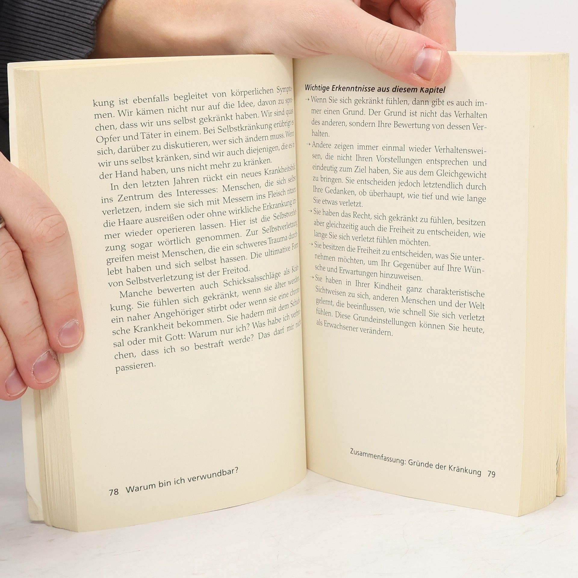 Kennen Sie Ihren wunden Punkt? In nur wenigen Sekunden kann ein Satz oder eine Geste das Selbstwertgefühl erschüttern. Gekränktheit stellt uns als Person in Frage und führt oft zu Rückzug oder Überreaktionen. Dr. Doris Wolf, Psychotherapeutin, erläutert in ihrem Ratgeber, warum bestimmte Dinge uns besonders treffen und bietet praktische Tipps, um Gedanken und Gefühle positiv zu beeinflussen. Sie behandelt Fragen wie: Bin ich zu empfindlich? Wie entsteht Gekränktheit und wie kann ich mich davor schützen? Ein ausführlicher Fragenkatalog zur Selbstanalyse hilft, persönliche Verwundbarkeiten zu erkennen. Praktische Übungen unterstützen dabei, typische Schockreaktionen und negative Gedanken zu überwinden. Zudem gibt es wirksame Strategien im Umgang mit schwierigen Menschen und Beleidigungen. Dr. Wolf zeigt, wie man Gefühle kontrolliert, besser mit Kritik umgeht und Konflikte löst. Ihre effektiven Selbsthilfetipps fördern Gelassenheit und Selbstbewusstsein. Egal, ob ungewollte Beleidigungen oder gezielte Kritik: Wir haben die Kontrolle über unsere Emotionen und Reaktionen. Schritt für Schritt lernen Sie, selbstzerstörerische Gedanken zu stoppen, Ihre Selbstachtung zu stärken und Ablehnung sowie Kritik gelassener zu begegnen.
