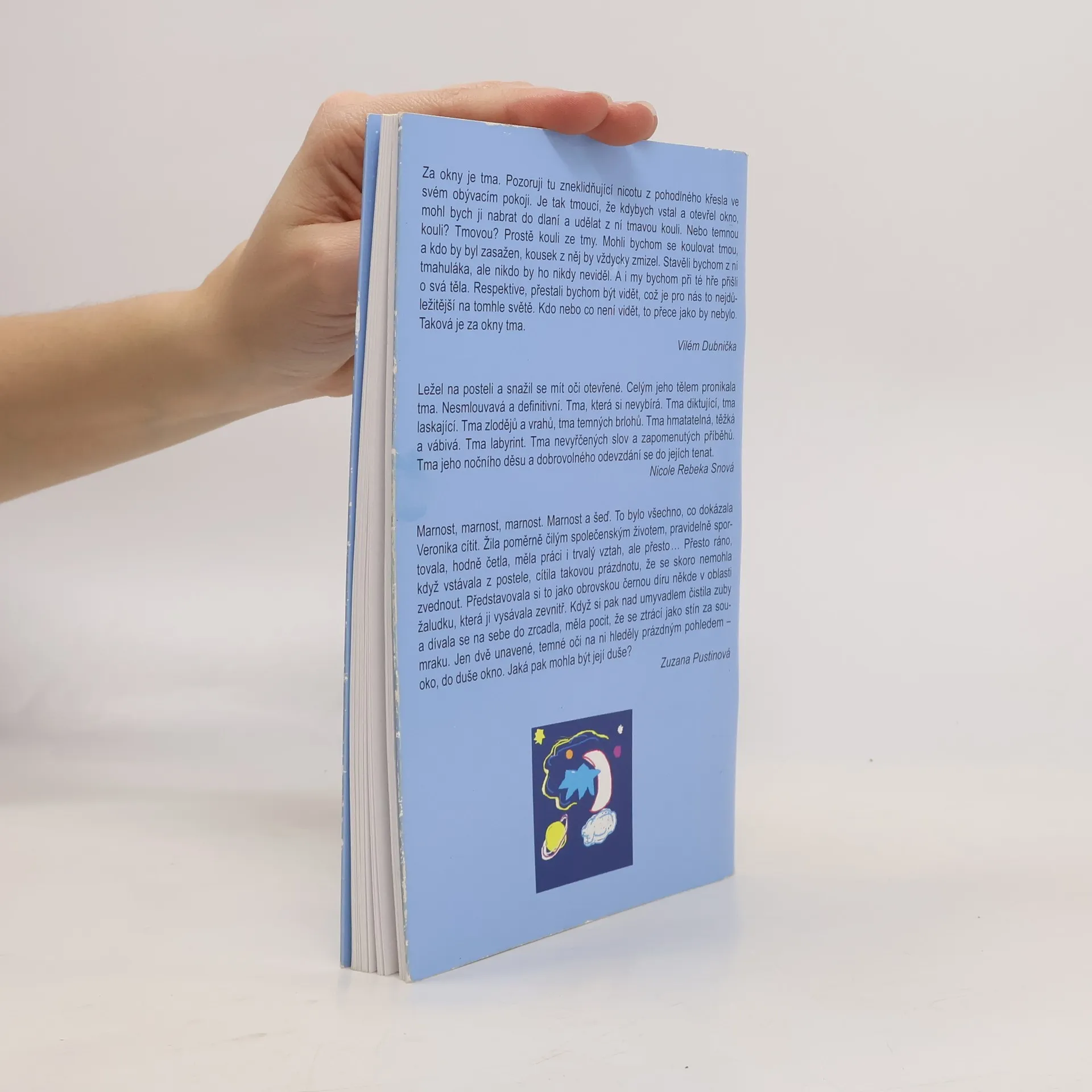 Sbírka povídek Za okny tma je výběr nejlepších textů, které přišly do soutěže o nejlepší povídku na stejnojmenné téma. Při čtení budete hledat cestu za světlem z temného labyrintu vlastních myšlenek, vyzkoušíte si terapii tmou, dozvíte se, co se stane, když se uprostřed dne na hodinu setmí, navštívíte třídní schůzky jednoho nezbedného dítěte, prožijete několik rodinných traumat, abyste nakonec odletěli do vesmíru za Malým princem. Při čtení se budete bát i smát, rozhodně se však s touto knížkou nebudete nudit. Autoři: Y. Puchýřová, E. Gregorová, M. Míčková, Z. Pustinová, V. Dubnička, K. Dostálová, O. Blechová, N. R. Snová, J. Svoboda, E. A. Kubičková.