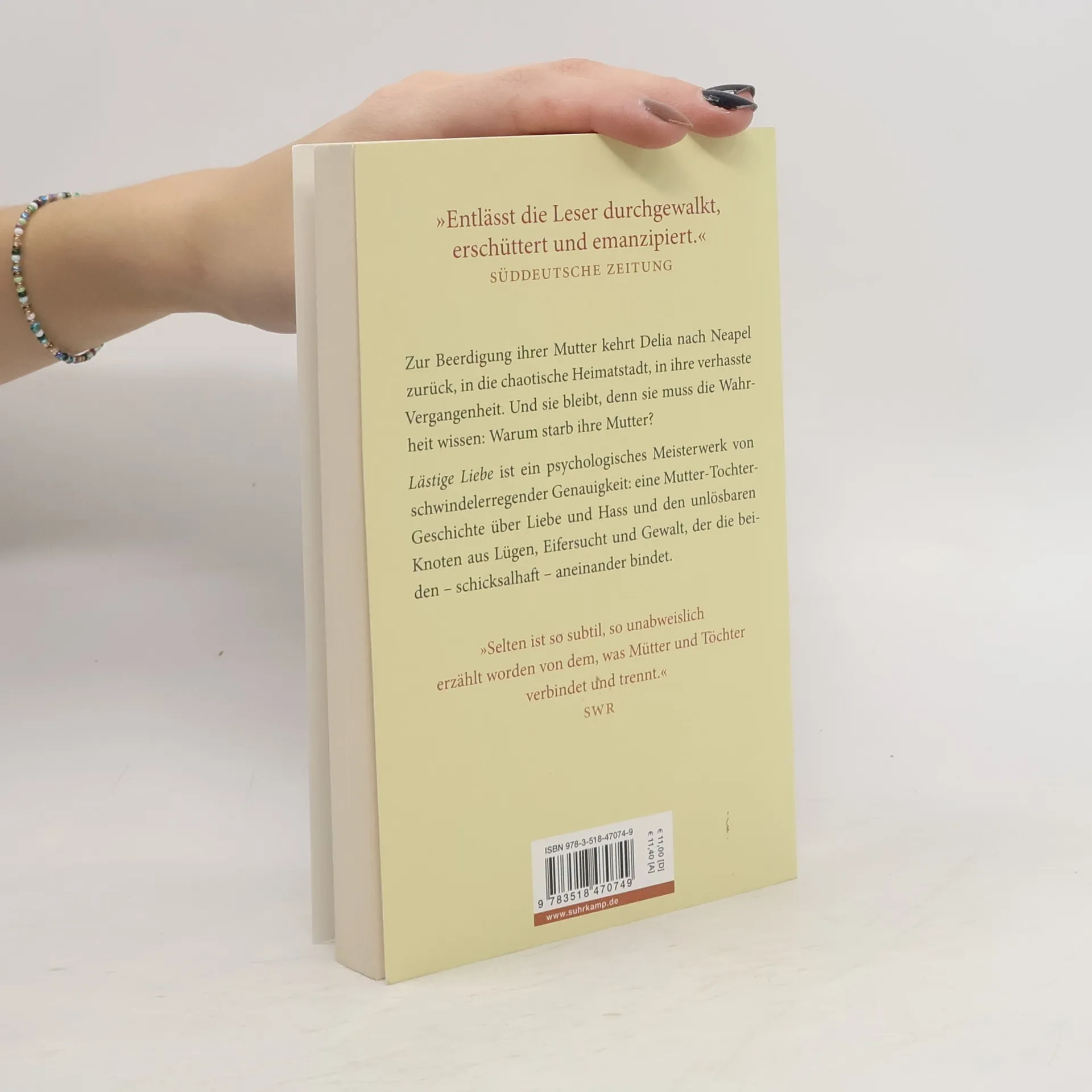 Lästige Liebe ist ein psychologisches Meisterwerk von schwindelerregender Genauigkeit: eine Mutter-Tochter-Geschichte über Liebe und Hass und den unlösbaren Knoten aus Lügen, Eifersucht und Gewalt, der die beiden – schicksalhaft – aneinanderbindet. Dreimal ruft sie an, sie klingt verstört, und eigentlich sollte sie im Zug nach Rom sitzen, unterwegs zu Delia, ihrer Tochter. Wenig später wird ihre Leiche an Land gespült. Zur Beerdigung kehrt Delia nach Neapel zurück, in die chaotische Heimatstadt, in ihre verhasste Vergangenheit. Und sie bleibt, denn sie muss die Wahrheit wissen: Warum starb ihre Mutter? Und welche Rolle spielt Caserta, ein ehemaliger Freund ihres Vaters, der plötzlich wieder auftaucht? Er jedenfalls scheint der Letzte zu sein, der die Mutter lebend gesehen hat. Zunehmend verzweifelt, läuft Delia durch die Gassen der Stadt und entwirrt Erinnerungen, die sie lange unterdrückt hatte. Noch ahnt sie nicht, wie schutzlos sie sein wird, gegen das Geheimnis ihrer eigenen Kindheit …